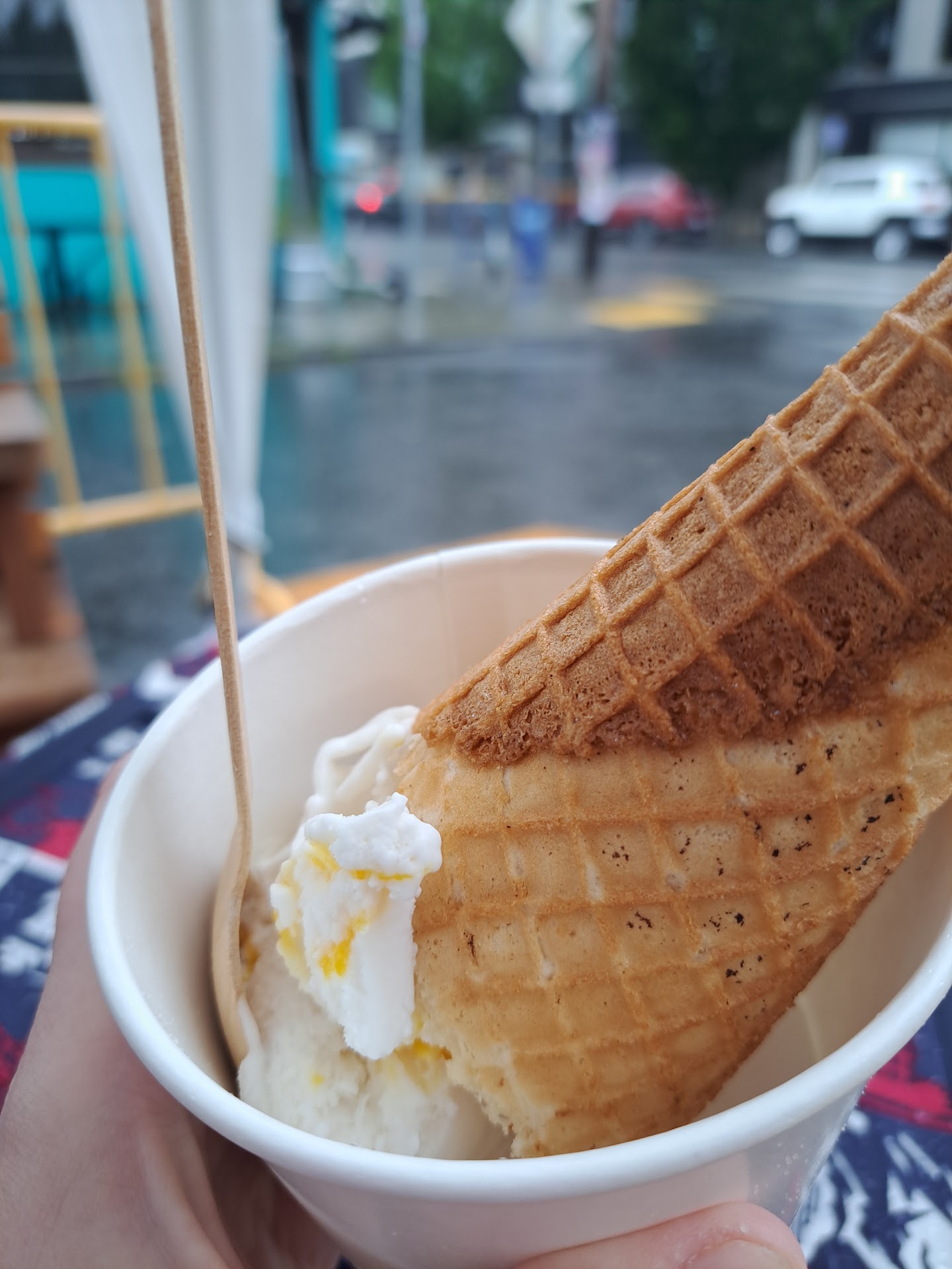 Lack of Indoor Seating: I've read several reviews to try their Mango Sticky Rice ice cream, so I thought I'd give them a try while I was in the neighborhood on a cold and quite rainy Saturday. I was a bit surprised they still don't allow indoor seating, which I would've been more upset about had it not been for a large tented area right next to Crema coffee nearby as it was pouring rain out. If they're not going to have indoor seating, I would've liked signage pointing to this tent area.