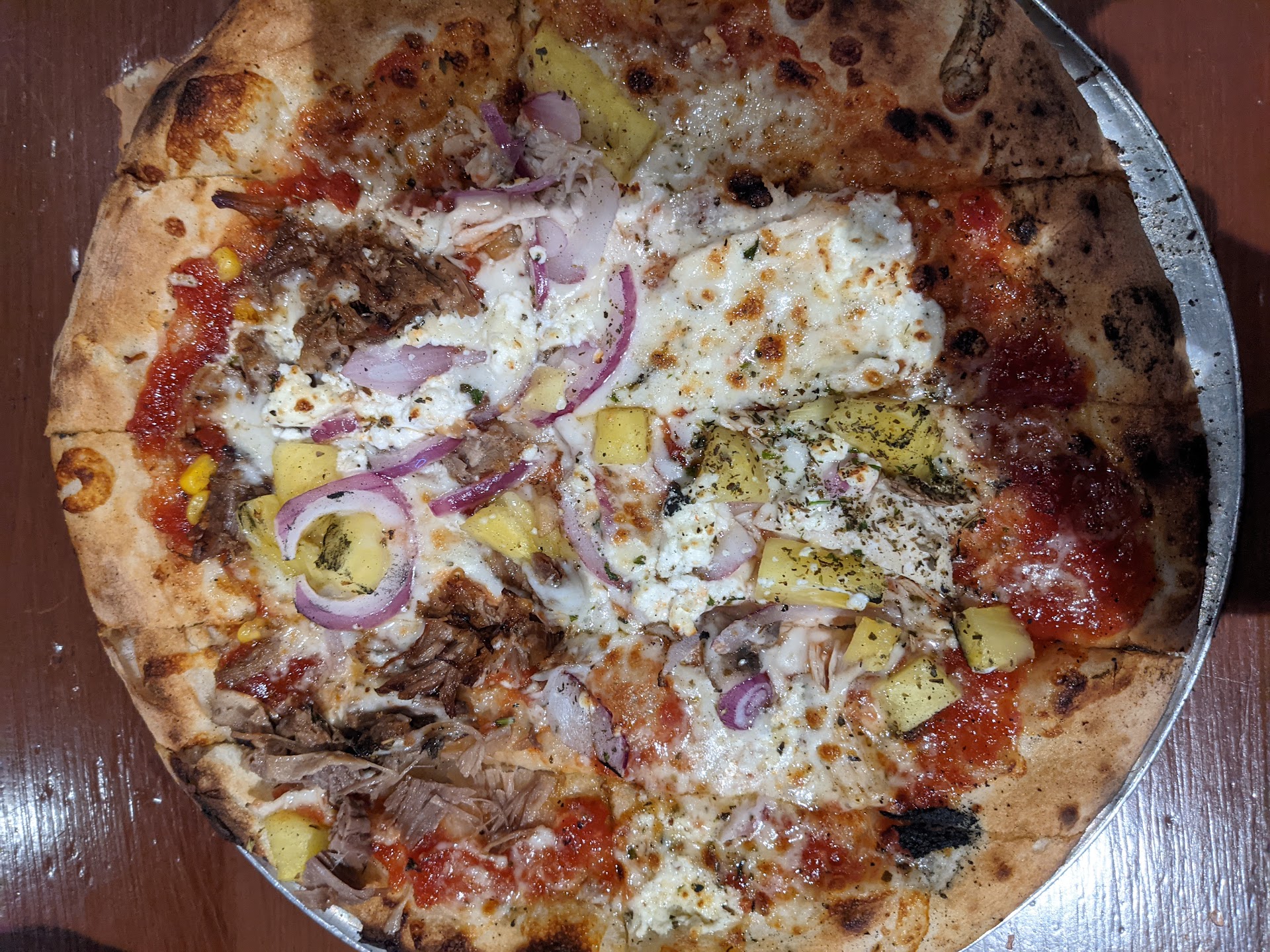 My wife and I both got small flatbread pizzas. I got the Mopsy’s Kalua Pie, which had, smoked free-range pork shoulder or oven-roasted free-range chicken (I got both), homemade organic mango BBQ sauce, organic red onions, fresh pineapple, Sunset Acres goat cheese, whole milk mozzarella, Parmesan, garlic oil, organic herb mix. This was an exceptionally good pie. I really enjoyed the mango bbq sauce as a base and the goat cheese with the mozzarella really made for a pleasant taste. I really appreciate the fact that they offer higher quality meats and toppings as it really imparts better flavor to the meal. The only thing I didn't like is the ingredients were kind of scattered about in clumps. (See pictures) some slices had a whole bunch of pineapple or onions and some didn't have any toppings at all. They must have rushed through putting this together as they were busy and just threw the toppings on. I would like to have onion, pineapple, cheese and meat on every slice, not just on half of the pizza.
