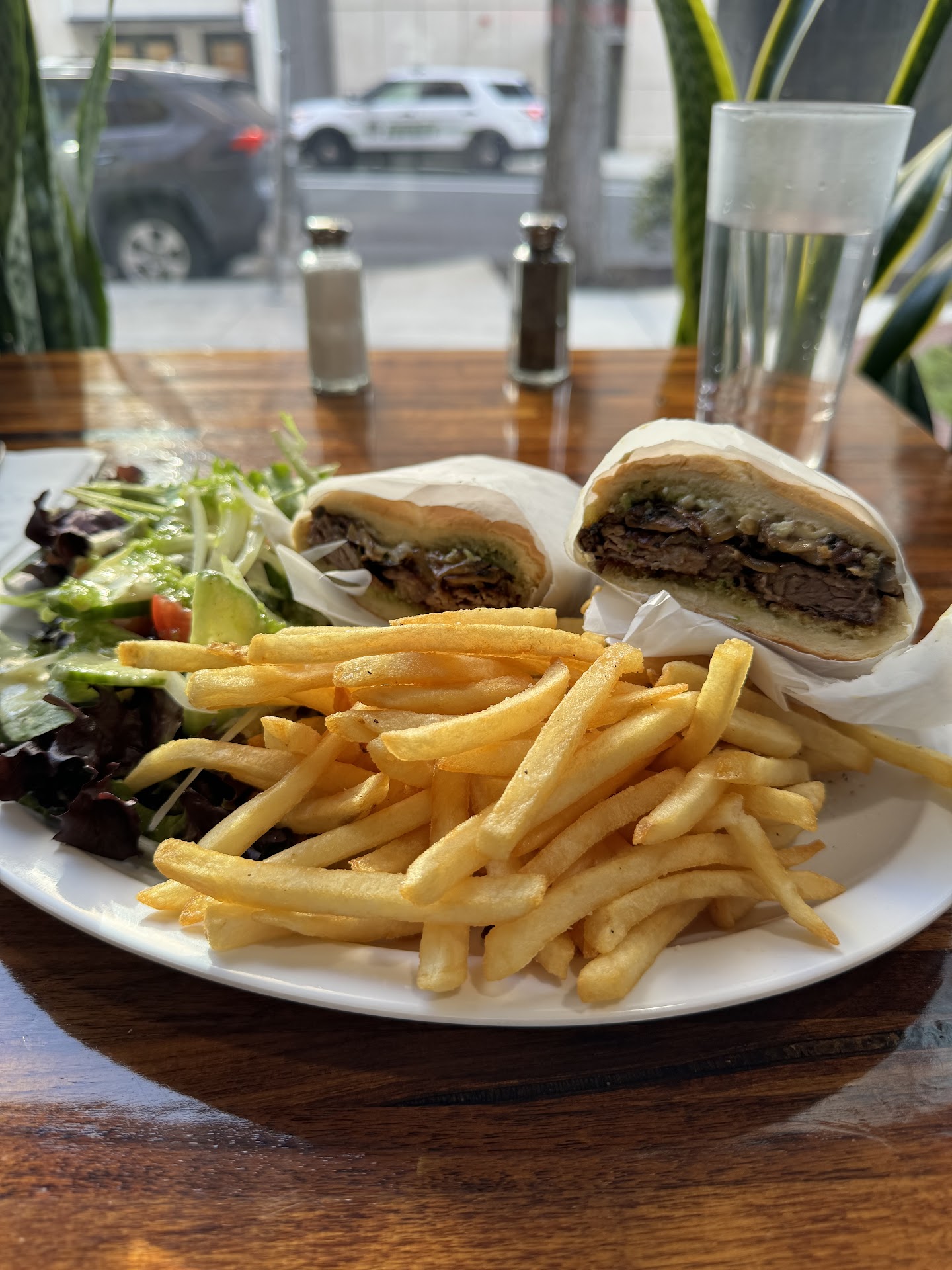 There was a patron wearing shooting-range yellow aviators still eating at a table behind me (your shades were awesome). He responded to my declaration before they could: “Yes! And it is amazing!” It was settled - I would try the Beef Brisket Sandwich. I added fries, paid for it, poured some water, found a place to sit and eagerly waited for my brisket sandwich to arrive. Maybe five minutes later the chef himself served the sandwich and fries. I thanked him and took a moment to admire the craftsmanship - there was also a nice-looking salad on the plate.