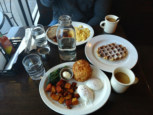 This is our go to spot for a weekend breakfast. Delicious Liege Waffles (different from normal "Belgian" waffles) made fresh. Because they are a different style waffle you get a little taster for free when you come in. Great options for toppings. I normally get the berries-n-cream waffle, but sometimes do the waffle of the day too depending on what it is. My girlfriend gets the more savory "breakfas of champions waffle" which is fresh fruit, yoghurt, granola and honey on the liege waffle. Both my sweet waffle and her not as sweet one are always delicious. They do have normal breakfast stuff like omelets too, though the waffels are so good I haven't ever tried the other stuff. Coffee is always really strong. They are the first place I have been to where the iced coffee is made with coffee ice cubes (so it doesnt get wattered down, its awesome). Great food all around.