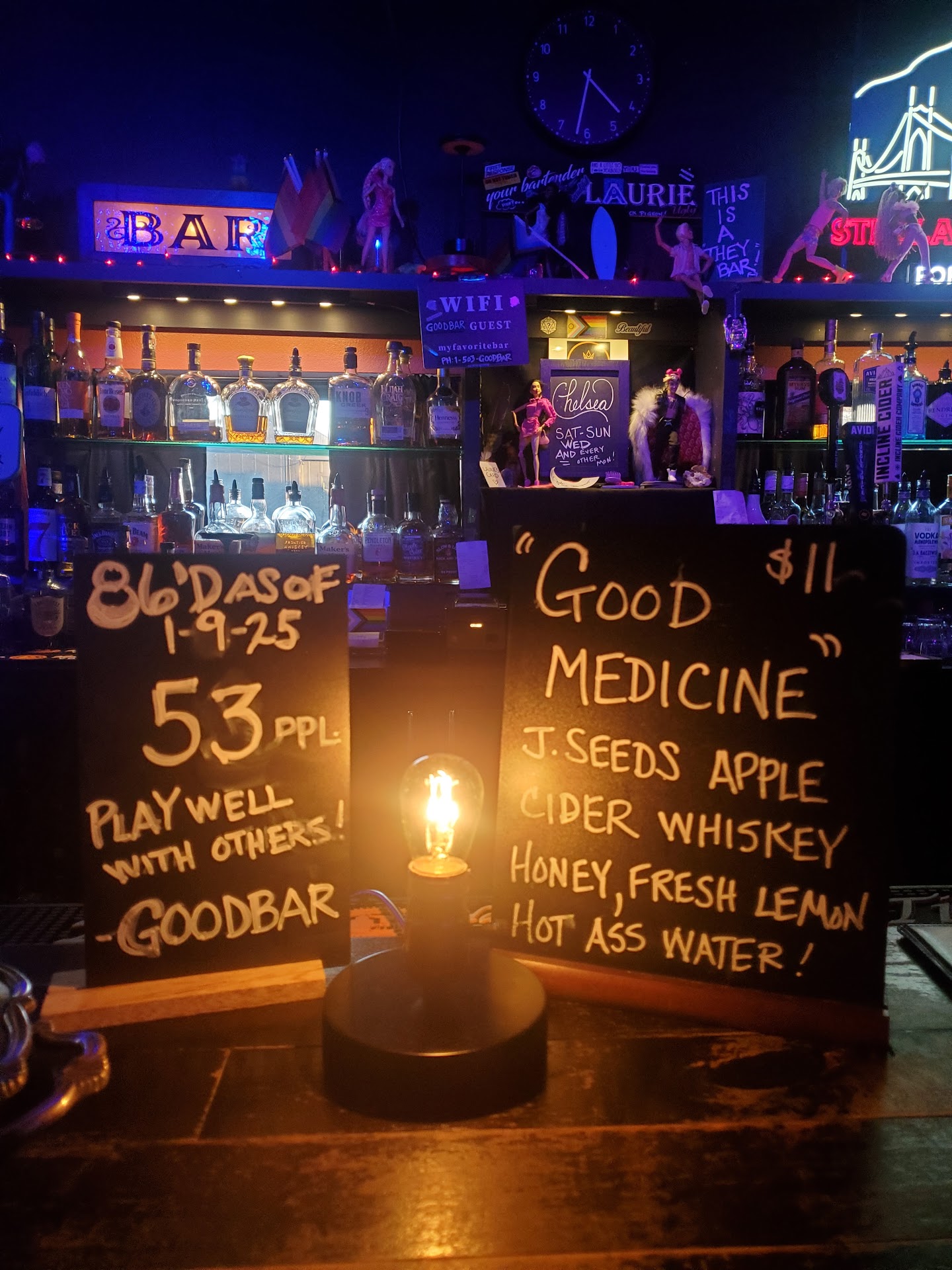 Ā Ā Ā Read moreThis little spot has had many different names and vibes over the years but Goodbar is the best. The service is friendly and they make a solid beverage. Since the new owner took over the food has gotten SO GOOD. I highly recommend the grilled chicken quesadilla that comes with fresh, warm chips. The donāt skimp on cheese or chicken and it tastes damned good. There is a cozy, covered fire pit outside for friendly chats with the regulars and kept very tidy. This is a spot I look forward to coming...