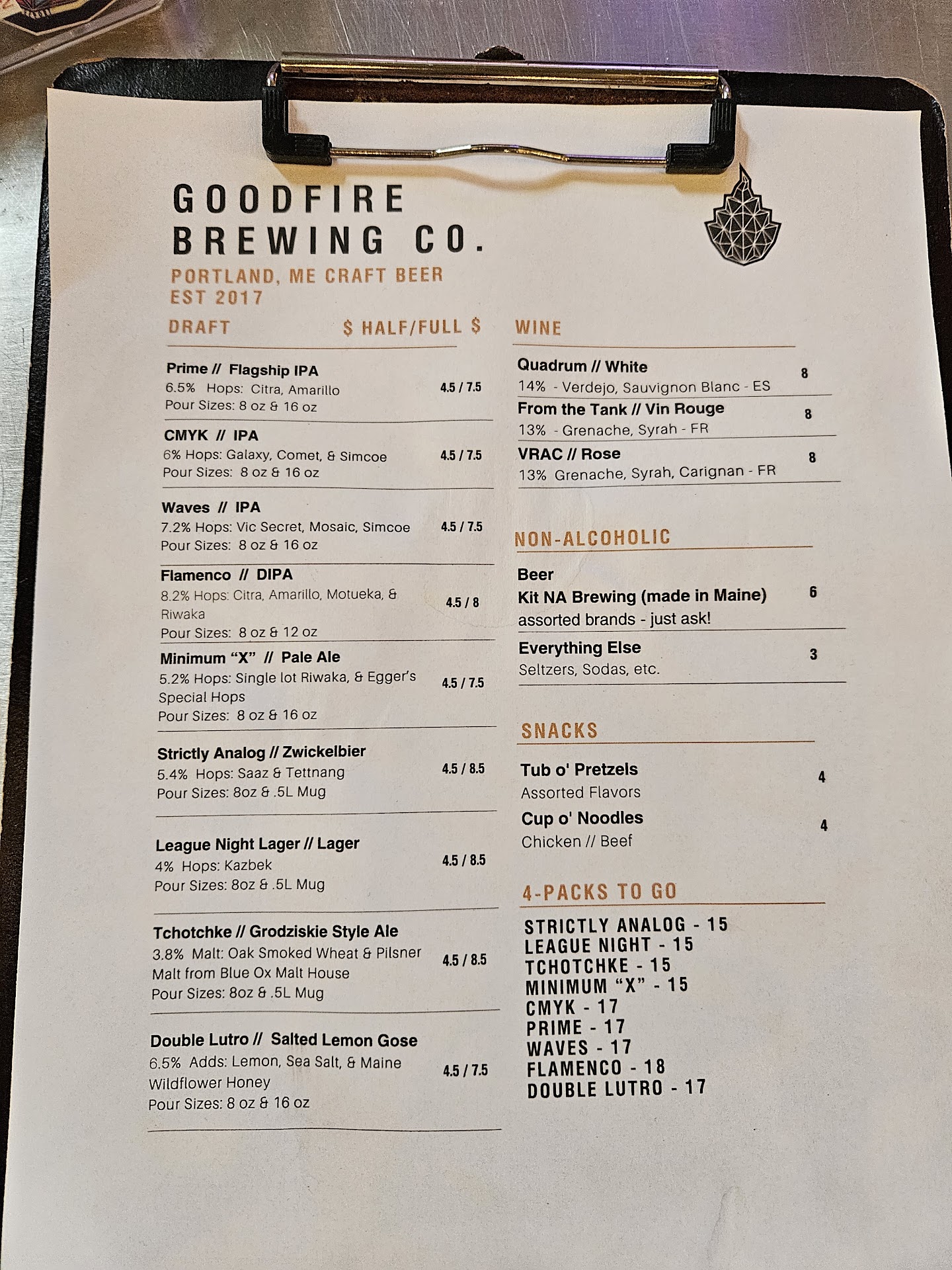 Goodfire Brewing Co. in Portland, Maine for two pints & a half pour on a Sunday afternoon. I was here last about a year & four months ago on my previous Portland tour, but had been looking forward to returning to try some more offerings. My friends & I were doing nine different breweries in one day so I had been keeping it light & was happy to be able to grab a couple beers under 5%. I wanted to attempt to keep my wits about me as we walked from place to place. Earlier in the day we had passed the Goodfire taproom in Freeport, Maine, but decided to check out the Portland location again since it was pretty much next to our AIRB&B. š»šŖ