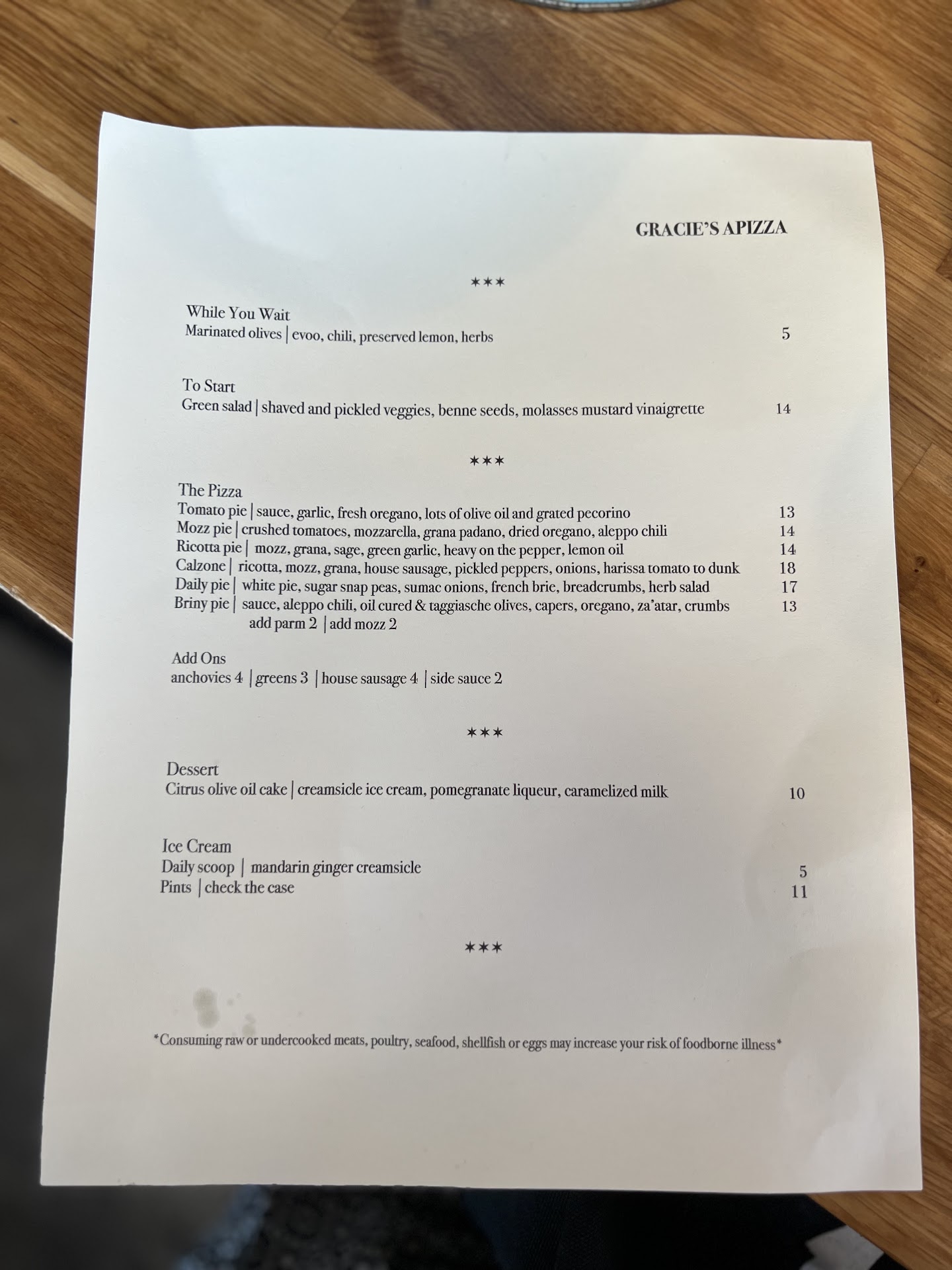 Gracie's is making the best pizza I've had on the West Coast and maybe the best I've had in the US, full stop. The classics are amazing (margarita is back on the menu and it's incredible, but the tomato pie is an absolute showstopper) and the rotating specials are both creative and perfectly balanced. Great small selection of beer, wine, and cocktails that you can't go wrong with, plus homemade ice cream. Even the salad is fantastic. Sheesh.