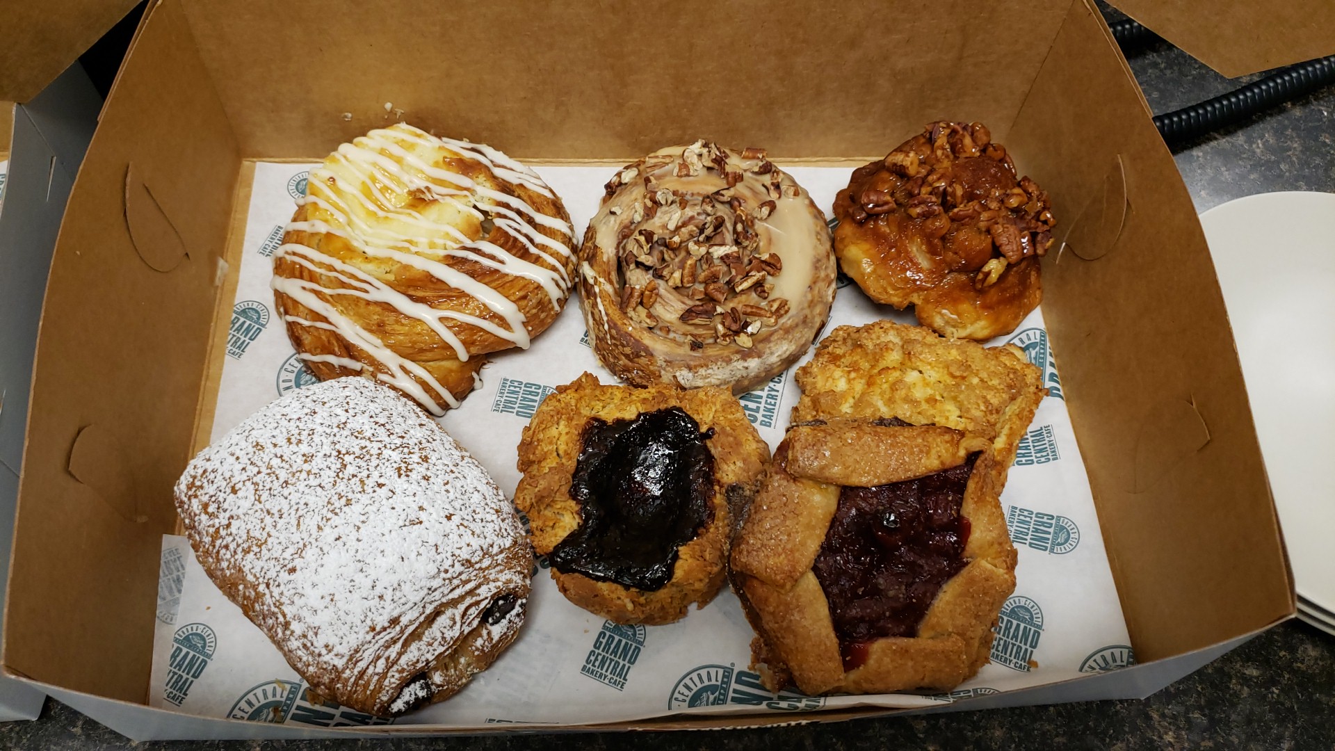 I selected a rustic cinnamon roll, a blueberry scone, a Cherry Danish and a Trial Mix Cookie.
