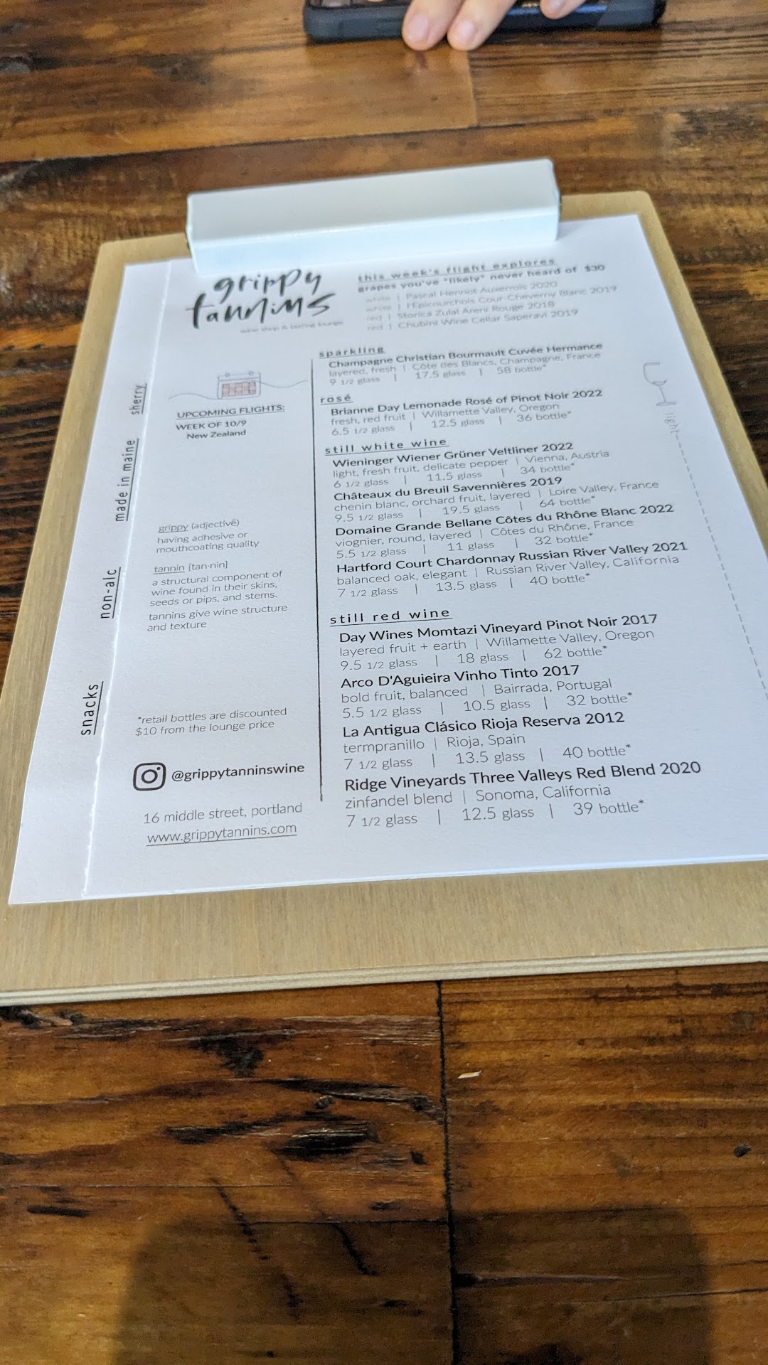 What really sets Grippy Tannins apart for me— aside from the chic, cozy vibe inside — is the unique setup. You can pick any bottle from the shop to enjoy in the lounge for just a $10 corkage fee. Browsing their shelves, packed with hundreds of options, is half the fun. We always end up with something amazing, and to this day, we’ve never had a disappointing wine.