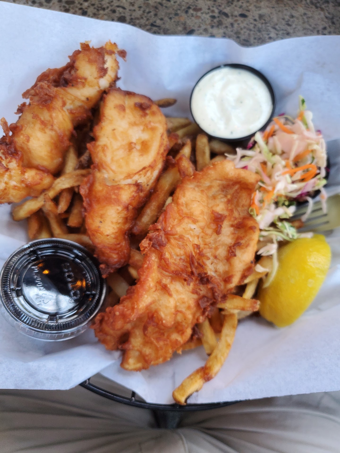 I think this food cart pod is really well done (in the sense of what food cart pods have become in Portland: safe, clean, inviting, family friendly). Many food options to choose from. There are many seating areas. There are actual restrooms. There is an area for people to separate their garbage into different streams. There is an actual bar inside (although I did not partake). I had the fish and chips from Tall Boy which was great: perfectly cooked fish and fries. Locally sourced options available. Salty, crispy, and delicious. Service was friendly, but unfortunately, my partner had eaten most of their meal by the time my order was ready. We also ordered the chicken samusars from Burmese Delight. They were a touch greasy but delicious with a spice I was unfamiliar with,...