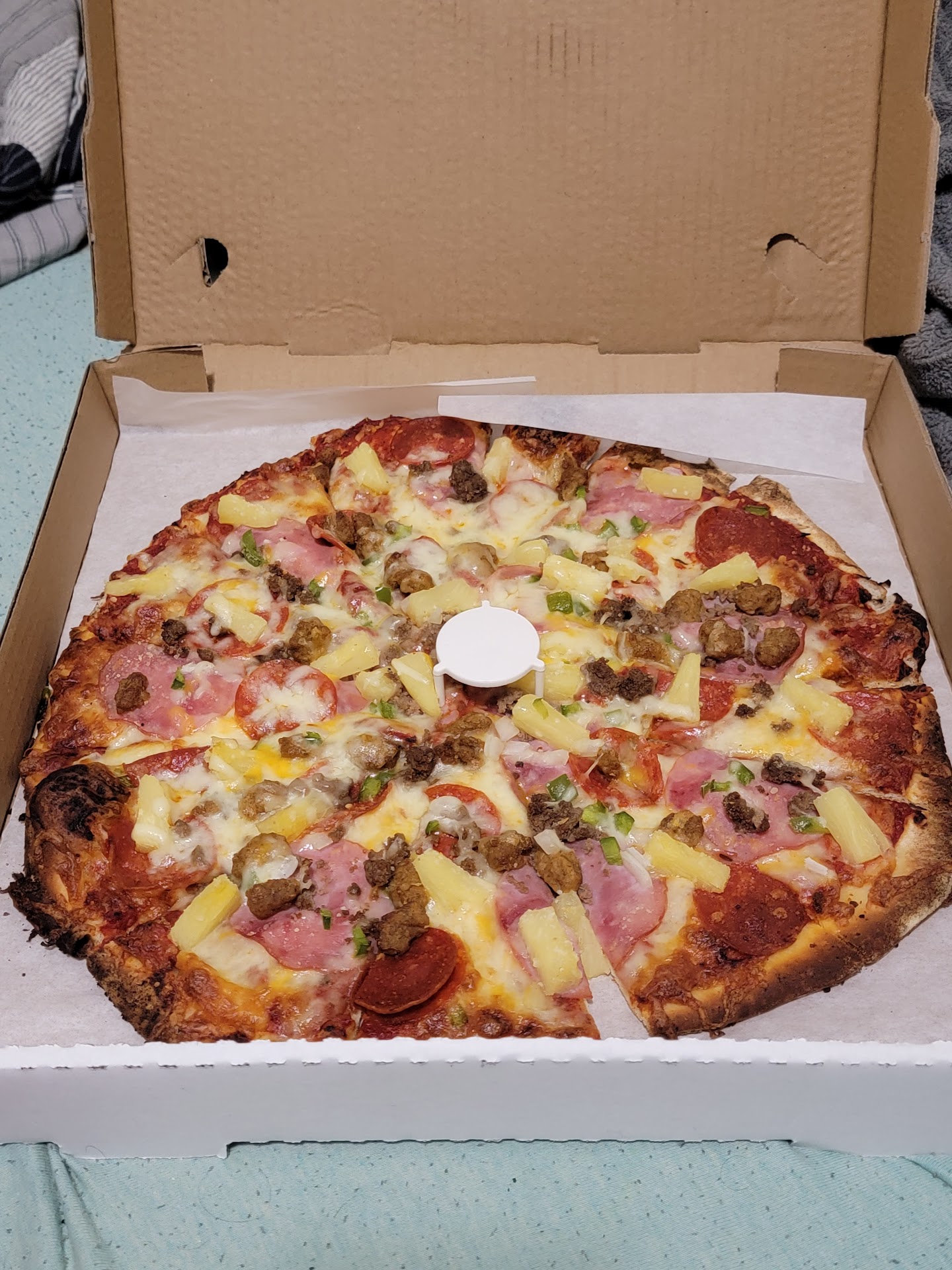 I love this pizza. Deck ovens make the crust so crispy. The pizza can be hit or miss with quality of toppings, however there are plenty of toppings. It's cheap and it's locally owned. I usually get Canadian bacon, pineapple, mushrooms, olives, and crispy bacon! I would say that it gets a 8 out of 10 for overall...