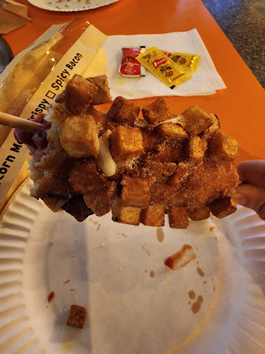 Came with a friend and ordered potato corn dogs (half sausage and half cheese) and a side of lemon honey chicken. It was so darn good. The lemon honey was super flavorful, juicy, a bit stiky to the teeth (like eating taffy) and just delish. The corn dog was as expected, crispy and airy. Everything was freshly fried (hot to eat, so be careful to cool it off a bit when).