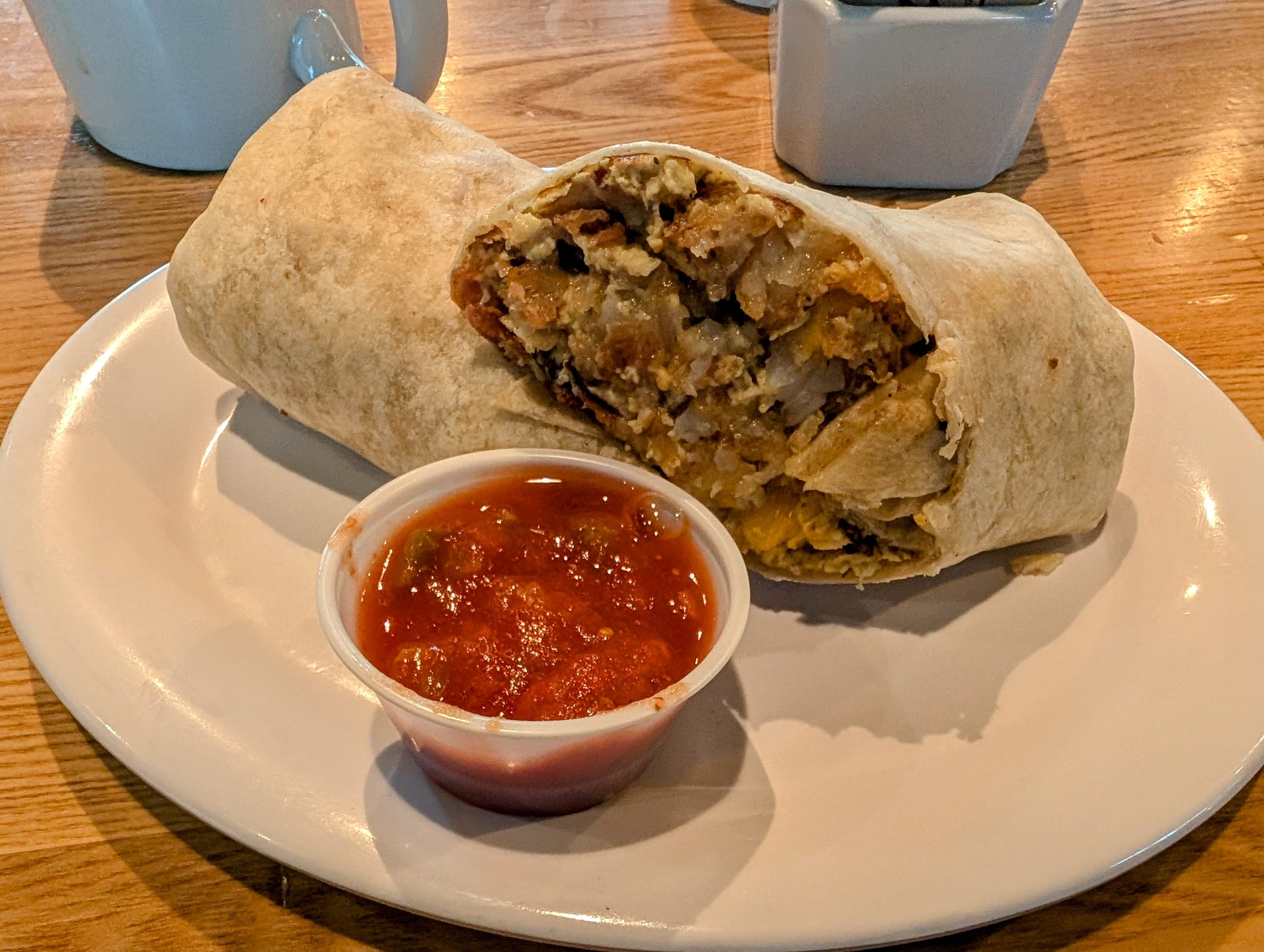 The menu is mostly focused on lunch time food, but they have a few breakfast items. I had the breakfast burrito with bacon. Many of their items feature tater tots, but not this one. I also got black coffee.