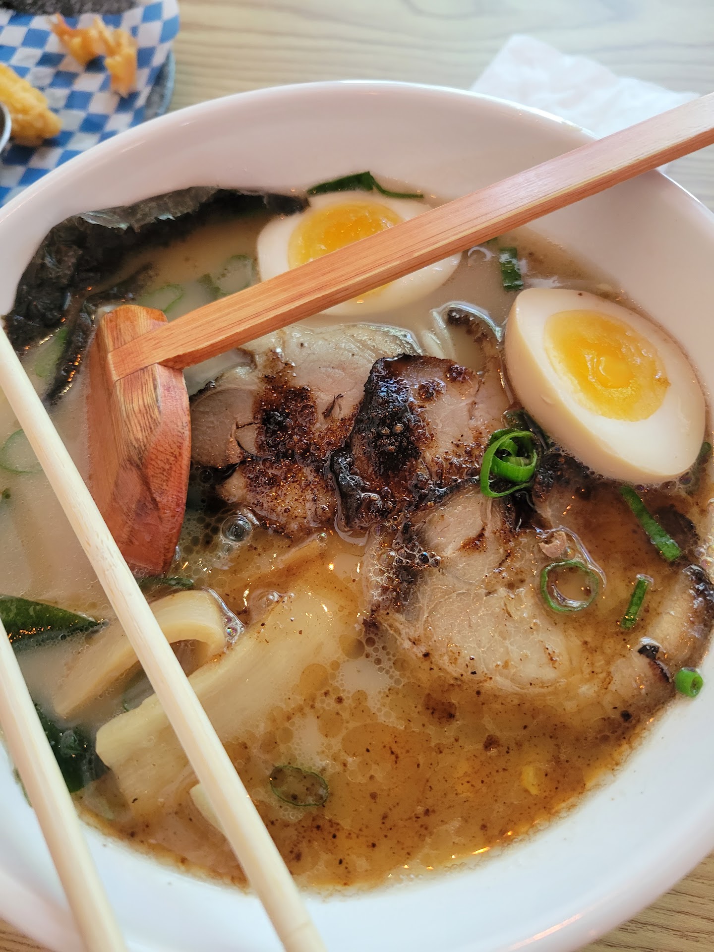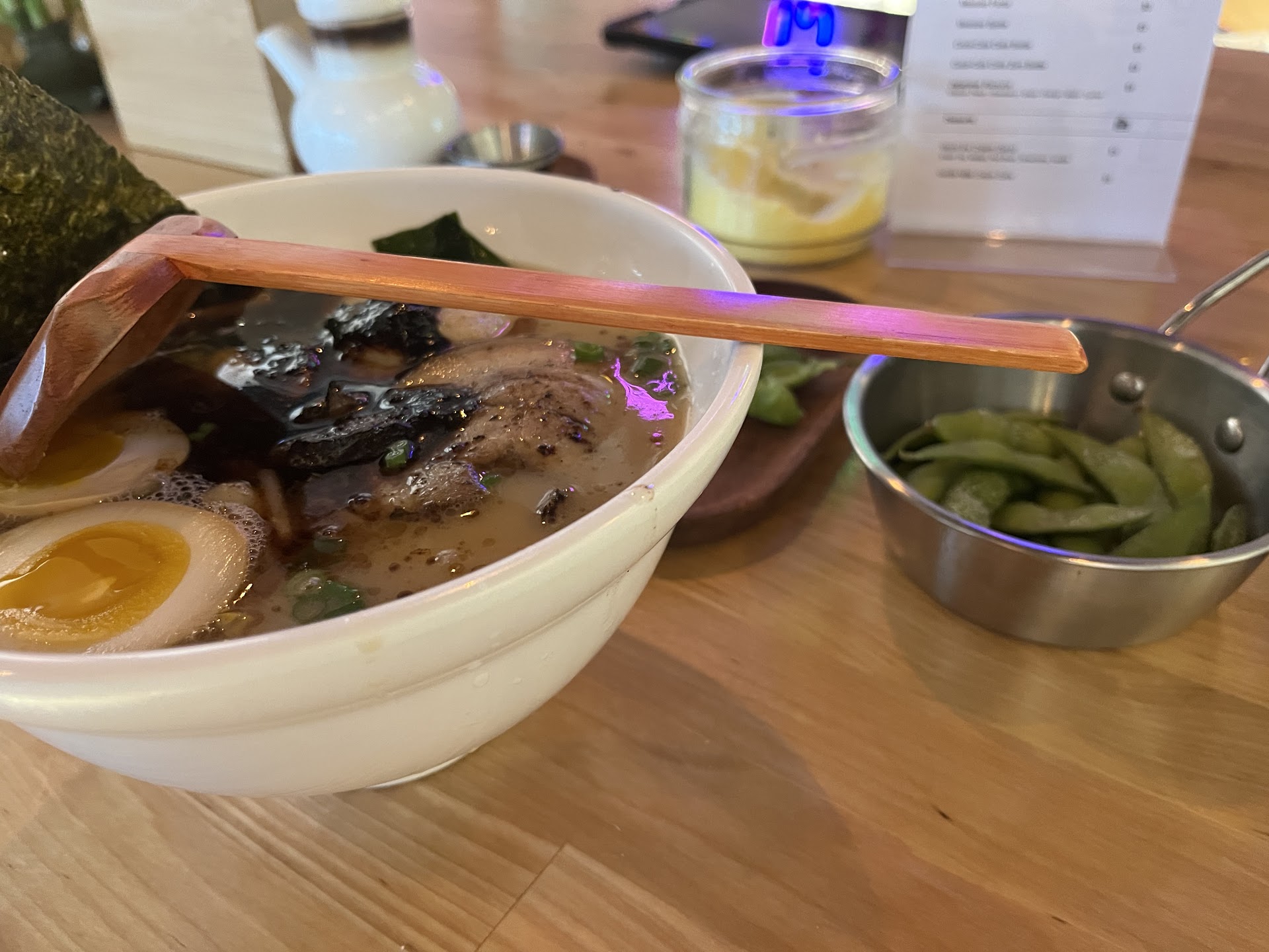 Beautiful, fun and clean ramen shop with very nice person who took care of us. Flavor wise, their broth could use a little bit more precision. The tan tan ramen broth needed a bit more salt and acid. The black garlic ramen also needed a bit more soy sauce. Or perhaps they can have more condiments on the table - even after adding some soy sauce and chili oil, the broth wasn't really right... I'm a super taster. Downtown street...