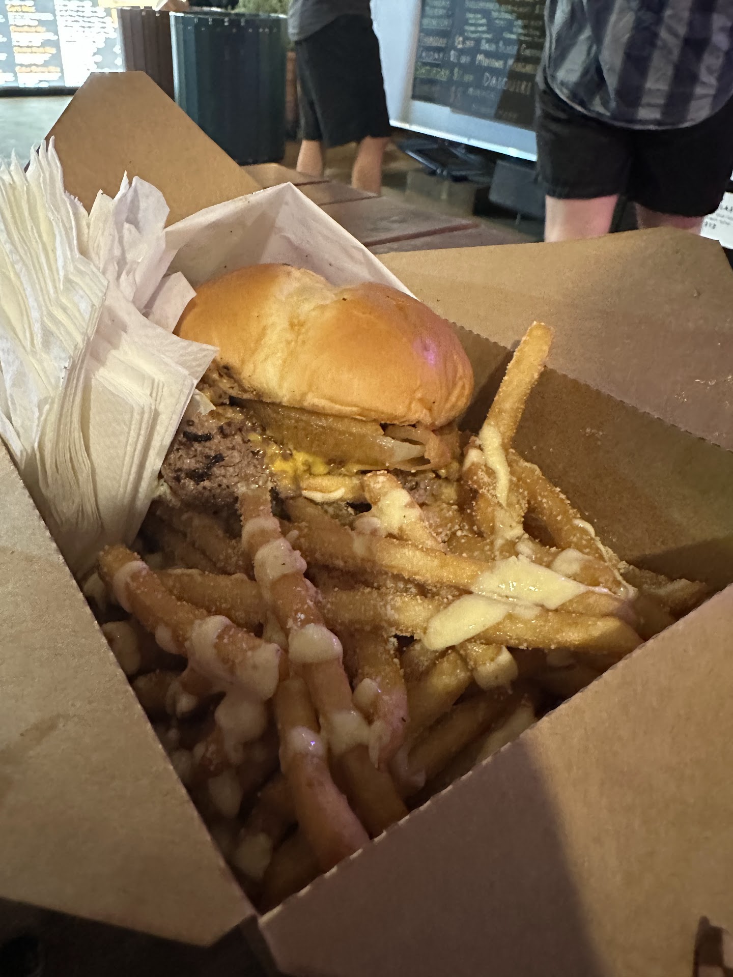 My girl got the north western smash box with the garlic parm fries. Which is their bbq sauces burger with an onion ring on it. The sauce was sweet and mixed well with the saltiness of the burger/onion ring. It was on a soft bun too. She loved it and the only thing she would change would be to add some P.B. to it. Her fries were the best and I wish I wouldāve gotten garlic parm on mine. Haha.
