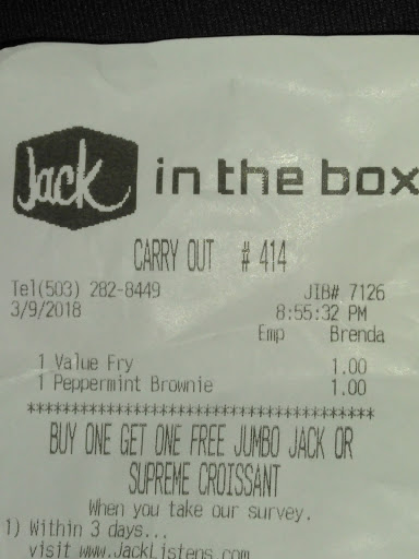 Read moreNormally I loooove JB, but THIS location is terrible!! I received a coupon text for ice tea while actually waiting in the drive-thru line,but when I kept trying to show the guy the coupon text I wanted to use he REFUSED to look at it and said that they DON'T send text coupons!! I finally realized after getting a manager, that when I said "I want to use the coupon you just texted me," the employee thought I meant HIM personally!! Really, he ACTUALLY thought I was saying that HE was able to send ME, a total stranger, a company coupon, when he doesn't have my number, and then thought I was trying to pass it off right to his face?!?! Seriously?? Do we need to start adding IQ tests to the employment applications now??!! Even the manager went circles with me for awhile because he needed some code that I didn't know. I showed him my phone 5 or 6 times and read to him where it said ONLY "present this to your server to redeem" but he kept refusing it because I didn't have a code. FINALLY he zoomed in and saw a little 3 didgit number by the picture and said "oh, there's the code, next time have your code ready!" Really??!! I'm the customer!! How am I supposed to know I need a code, or that a code even exists?! It just says "present to server!" It seems to me that a manager should know where the code is and should not be harping on customer's to do his job for him, the job that Jack in the Box is paying him to do. Both the employees and the manager at thus location are complete imbeciles. Unless you want to spend 10 minutes at the WINDOW to get an iced tea, after your wait in line, I do NOT recommend...