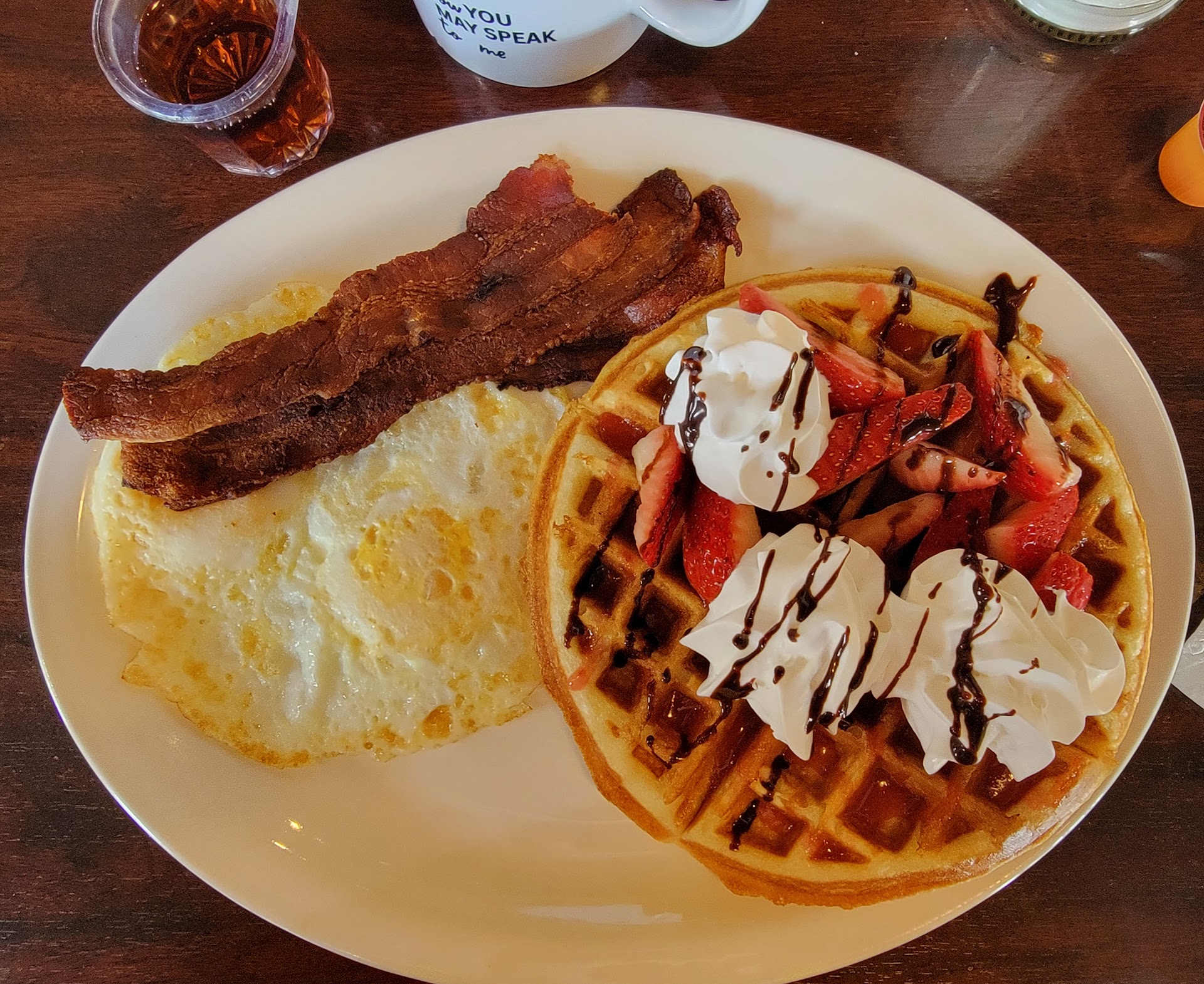 Read moreAmazing amazing amazing the music is so perfect so calming and melodic food was soo good and great portions I got a Cafe mocha and me and my husband downed it I want to point out specifically that I brought my 1 yr old and as 1 yrs old do she threw a tantrum but our server the amazing gal that she is noticed and immediately brought a water for the baby the thing she was throwing a tantrum over she was also very nice pancakes were heavenly waffles were crunchy in a good way and as my husband put it yummy wait time for food like 10 mins and to be seated none would definitely recommend and will be...