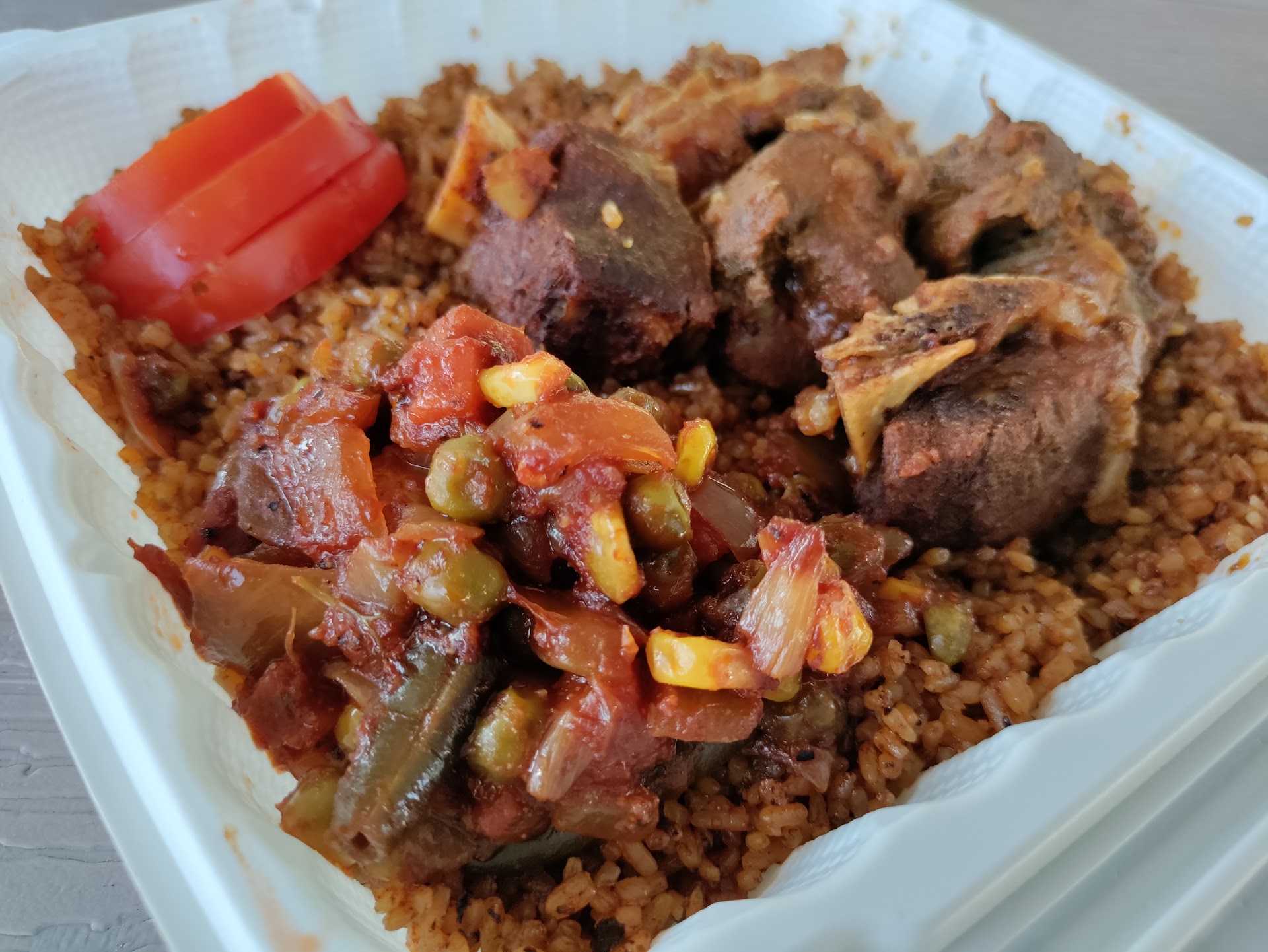 Today was my first visit to the Kabba's Kitchen food cart on North Albina Street. I ordered the Thié Bou Yapp (pictured), which is Senegalese lamb and rice.
