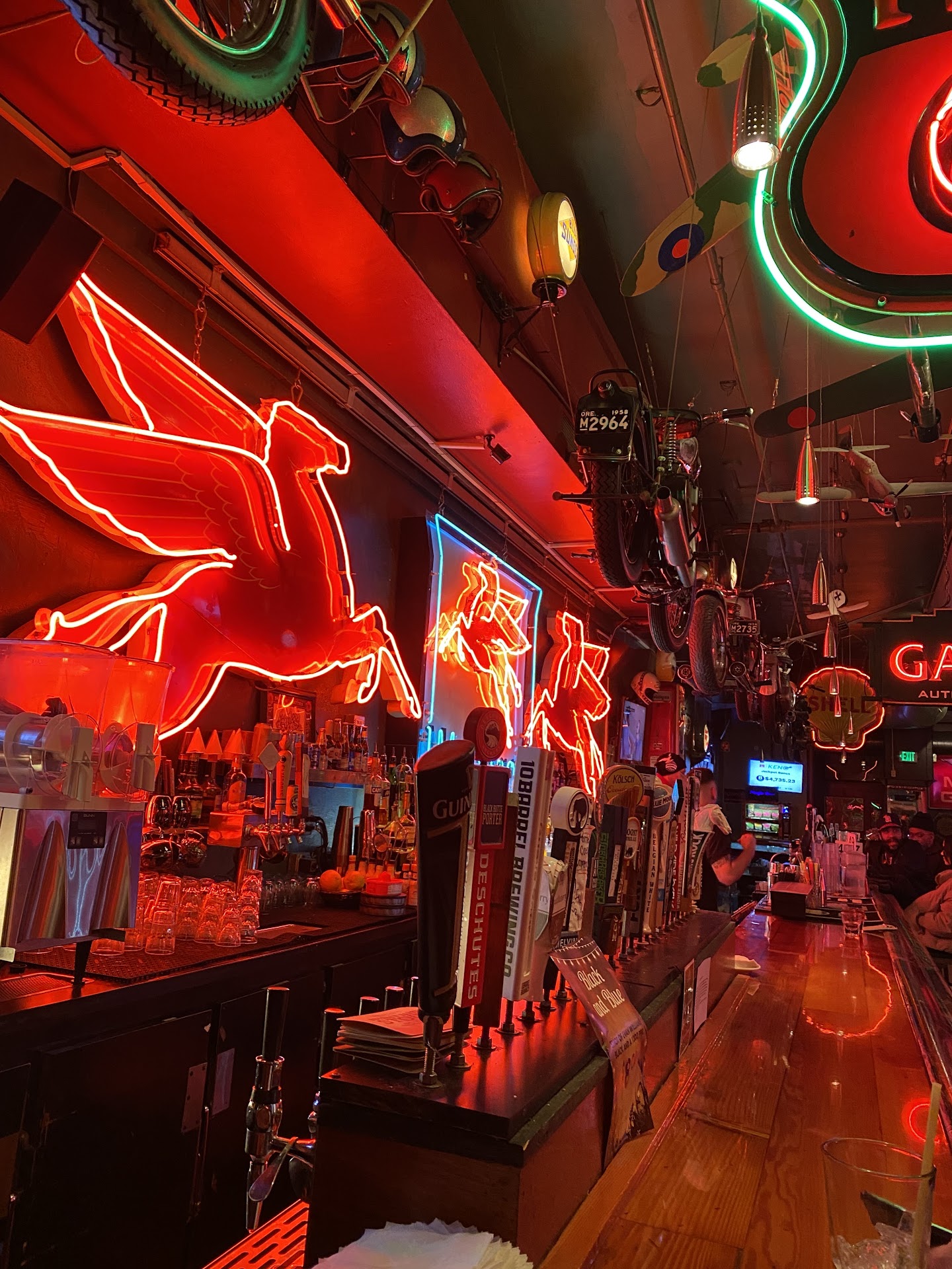A few minutes later, we walk through the doors of Kelly’s Olympian and I feel a sense of calm come back into my body. With the neon lights, kitschy motorcycle decor, and ambient atmosphere, it’s hard not to feel like I’ve just found a bit of respite from the outside world. I’ve never never been so glad to be anywhere but Dante’s Inferno. We take two seats at the bar, she orders an IPA and I get a glass of water. After attempting to regain my grasp on reality we start talking and it feels like falling in love all over again. We know nothing is as it used to be, that our relationship has changed in new and hard ways, and that making it work won’t be easy. But neither of us are here for easy, we’re here for each other. While we’re talking a nearby customer walks up to us and says, “the way you look at each other is beautiful, there’s so much love,” and walks away.