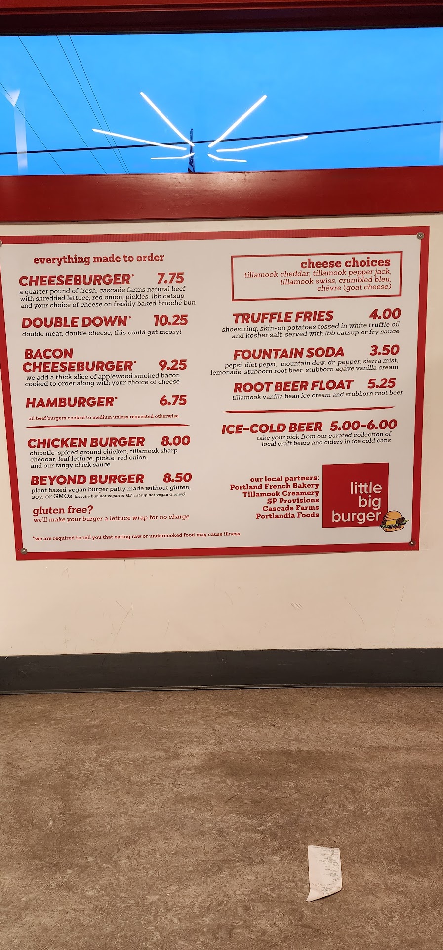 Seems like a low budget concept with little money to set it up, hoping at best, to break even. Three young men preparing food orders and a fourth as the front man at the cash register. High school age or perhaps recent graduates treat the job as just flipping burgers and lacking "food service" experience to give the customer a reason to return to eat there again and again. The recycle/trash area was a mess, as was the open floorplan where burgers are cooked. For the cost of the meals two of us had, the short end of the deal stuck in our throats. A quarter pound of greasy ground "meat" served with grilled onions and choice of Tillamook cheese served on game day sized slider bun, paired with french fried potatoes (that filled one fifth of the brown paper bag-was way more than 2 orders of fries we paid for). Portion control out of control will be a major factor of a business shutting down due to lack of profit from skyrocketing food cost. Great effort serving local OREGON food products, but their choice of catchup made with chili peppers, vinegar, garlic & onion powder and salt turns a mild, innocent condiment into a fire sauce I didn't expect. The second sauce by the same manufacturer was that same ketchup recipe blended with Hellman's Mayonnaise. Nasty Thousand Island dressing minus pickles...just plain nasty. The fountain soda (Coke) was watery and little carbonation but had a nice lid and straw. First impression walking in the front door almost convinced us to turn around to leave. Heavy cooking grease in the air hit us hard. Better vents and air filtration badly needed here ! I am fairly certain I won't be giving them another opportunity to make a good impression.
