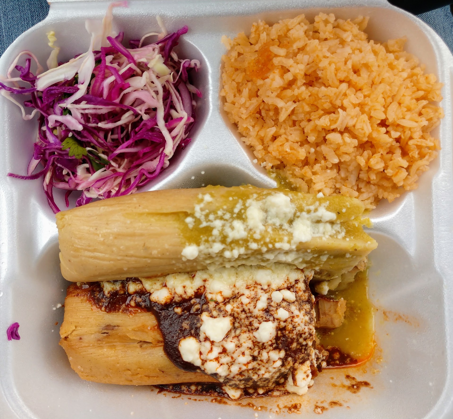 The order included two tamales with a Mole sauce.