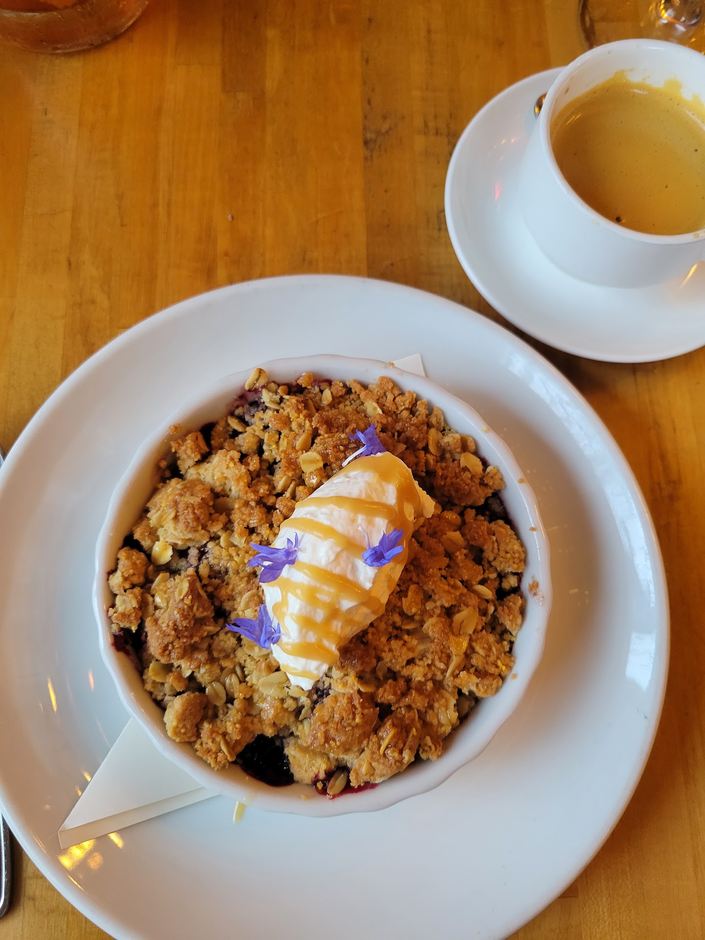 For dessert, as we were celebrating, we ordered the chocolate pot-de-creme with toffee cookies, and the warm GF Marionberry crumble with oat and polenta crisp topped with a dollop of real whipped cream and edible flowers.