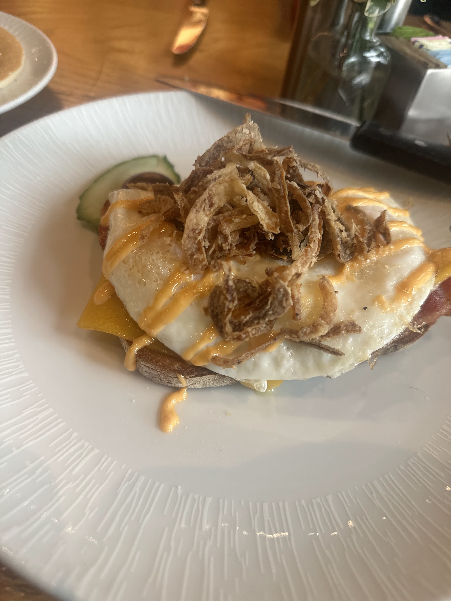 Thankfully, the bartender ended up being my server, and he was great – super nice, attentive, and made up for the lackluster start. I ordered the open-faced breakfast club and asked for no tomatoes since I’m allergic. They took the tomatoes off the sandwich, but there was still a cherry tomato on the plate for decoration. Thankfully, it didn’t touch the sandwich, but I wish they’d been more careful.