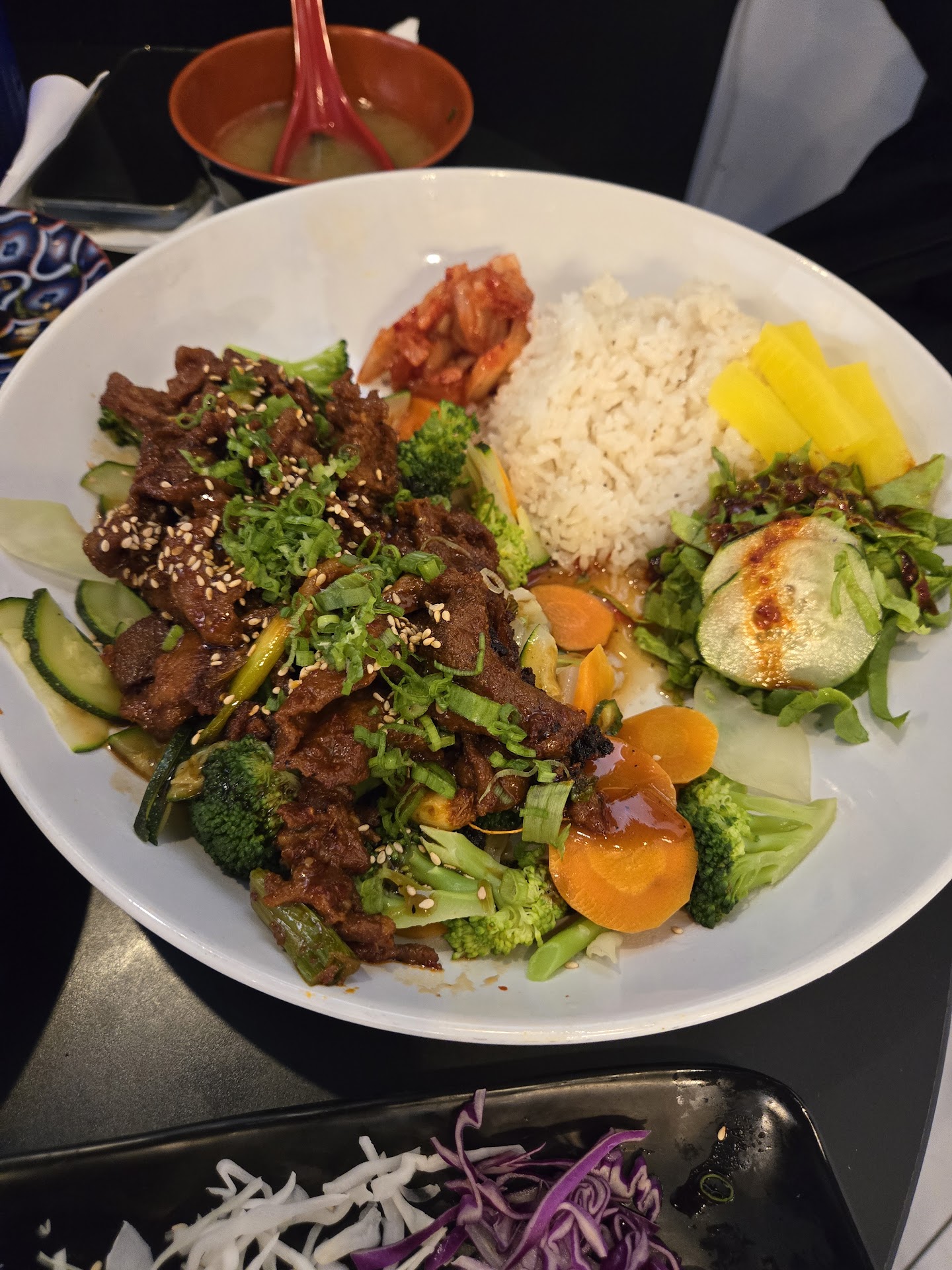 Spicy pork is not spicy but looks like it is. Good taste, so it’s marinated well and the meat isn’t tough to chew, like some other places. I loved the spicy pork bibimbap though. All fresh ingredients! They give a lot of vegetables, which is so nice, because other places are very sparing with their ingredients. I’m usually left with so much rice at the end. However, this place did a good job giving the right amount of ingredients. They also gave a small cup of miso soup - thank you! Would get this again!