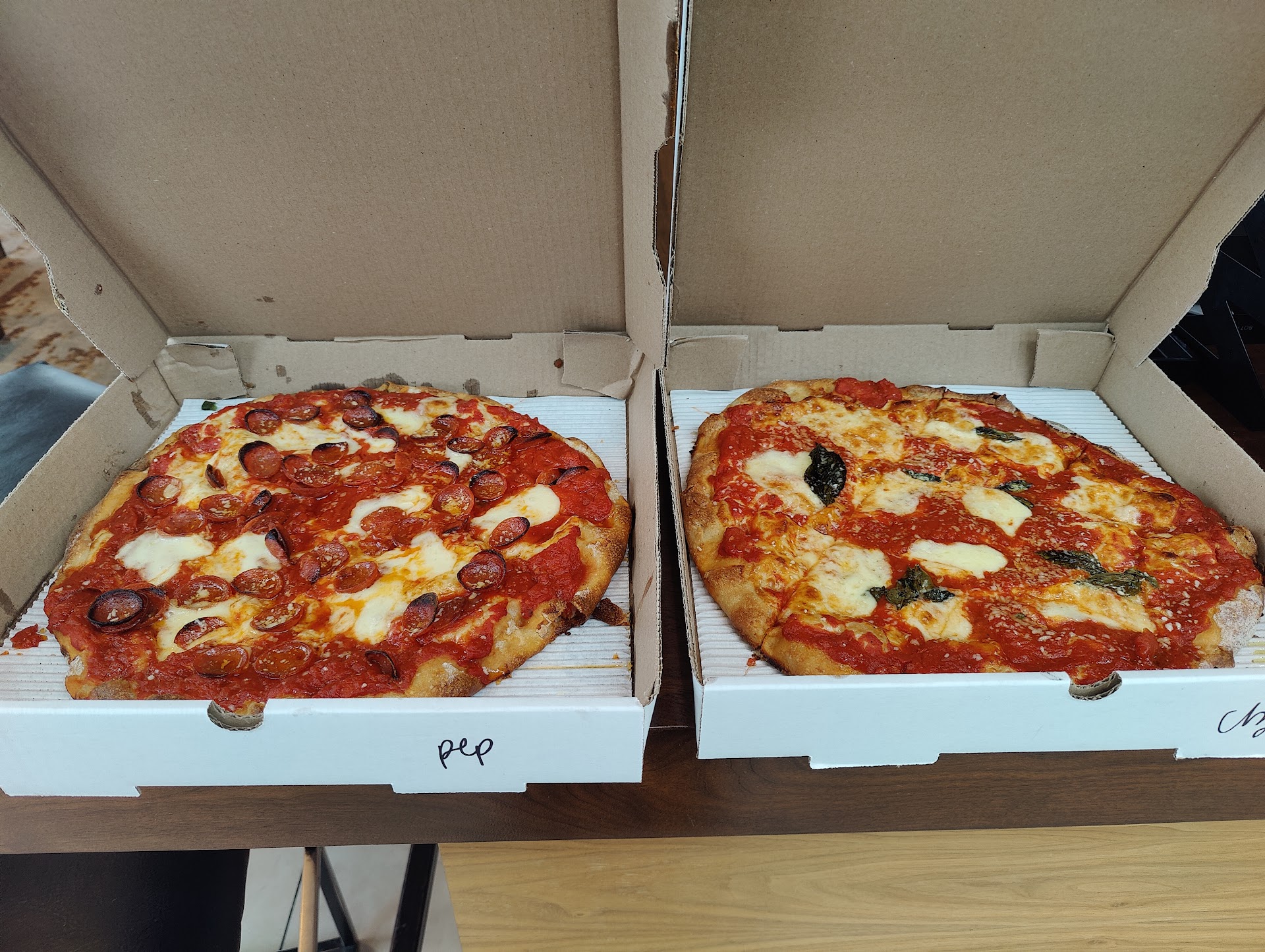 At 1:33 p.m., my name was called, and I received my pizzas, which were emitting an inviting steam, signaling their freshness. My initial impression upon opening the boxes was one of skepticism – the pizzas appeared messy and overly sauced, leading me to brace for a soggy disappointment. Yet, what followed was a delightful culinary turnaround.
