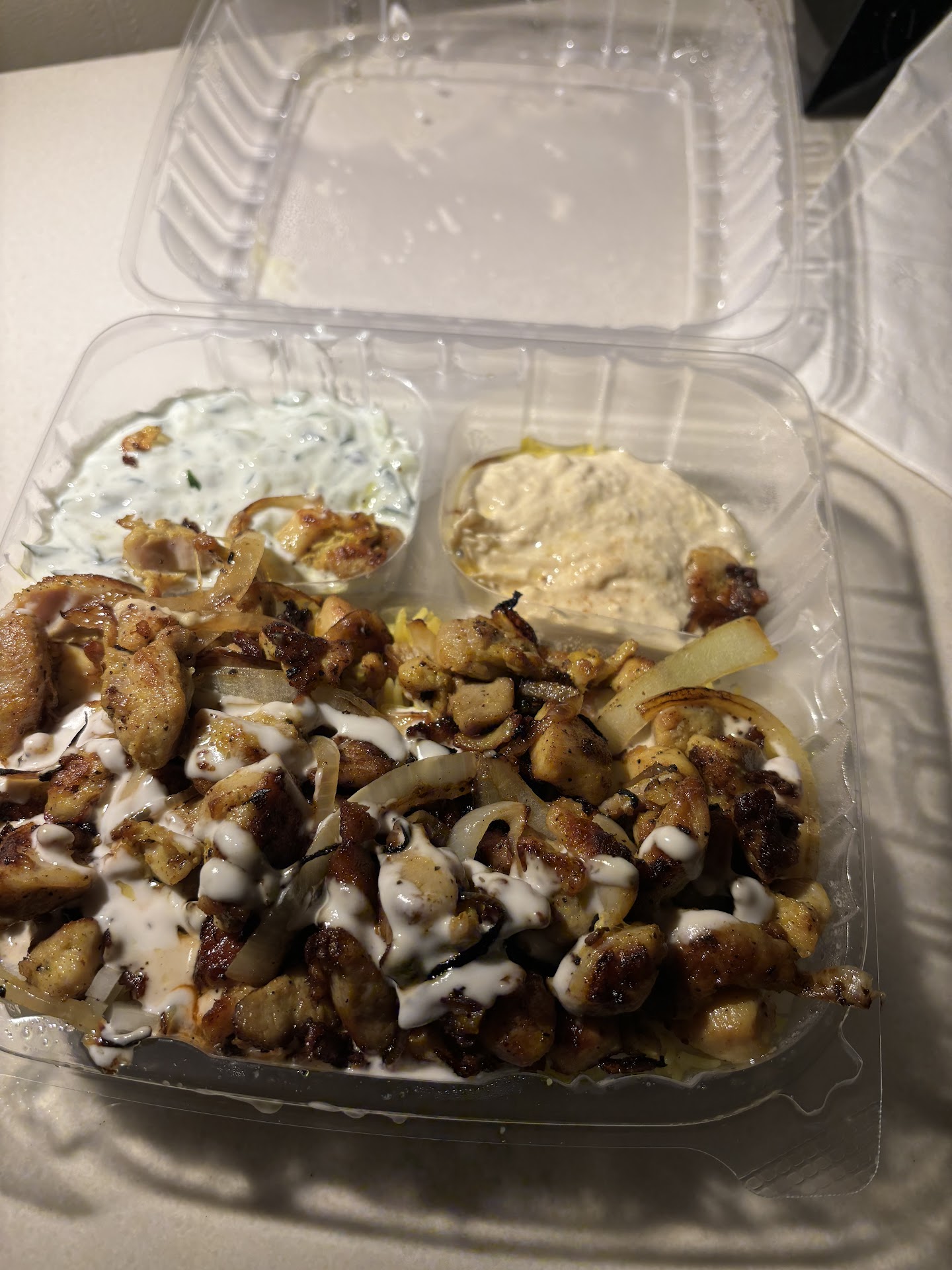 Read moreI’ve had middle eastern food in these food carts almost in every major city and I can confidently say this is the worst of all I’ve ever had. I wouldn’t say it’s objectively bad, but it’s just that food carts are often so good that this place doesn’t reach that threshold. We’ve had the chicken over rice; the chicken, which I’m pretty sure, is stale. It doesn’t chew right. The rice is okay. However, the sauces that provide a lot of flavor are kinda bland. Even when I asked for a lot of white sauce, he kinda disregarded it. While I was confirming what exactly comes in the box, he wouldn’t answer and just shrugs off.