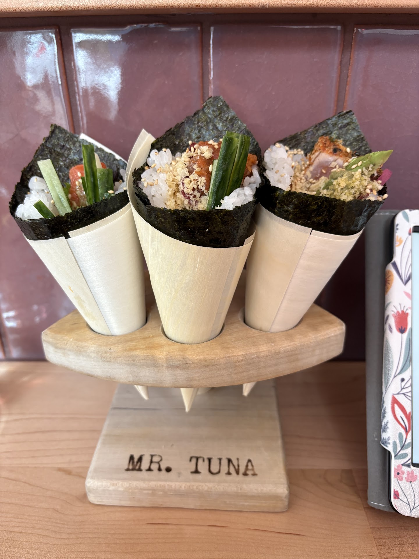 Read moreAs someone who has been eating Mr. Tuna for years, in various locations, I was incredibly dissatisfied with the food I ate in the new middle st. location. I frequented the Mr. Tuna food truck in the eastern prom and in the public market house, and always looked forward to the 3-handroll deal with fresh fish and vegetables. Unfortunately, this is not what I received at the restaurant. The restaurant itself is incredibly cute and cozy, and the service was impeccable. Both of my waitresses were very kind and made sure everything came out quickly. I ordered the salmon handroll, the spicy tuna handroll, the tuna tataki handroll, and the sunomono salad. The handrolls themselves were great- fresh vegetables and seaweed, and I am a huge fan of the mixture of tempura crunch and plum in the handrolls. I particularly loved the fresh shiso and kizami wasabi in the salmon hand roll, I wholly regretted not getting just vegetable handrolls. The real problem here - ironically - was the tuna. I could tell that the tuna was not fresh, it was not that great pink hue that tuna should be and was stringy and quite fishy, in both tuna rolls. Again, everything else in the roll worked perfectly, I just wished the tuna went along with it. Alongside the tuna, the salmon in the handroll was sparse, dry, and slightly stringy. It did not taste very fishy, but still was not as fresh as it should be for the price. The sunomono salad was incredibly disappointing. I love sunomono salads at other restaurants, but this one felt like a bowl of bread and butter pickles and a huge scoop of seaweed. It did not feel balanced at all, however the portion size felt good for the price. TLDR: stick to the veggie rolls here, or maybe try the tuna not in a handroll. I want the...