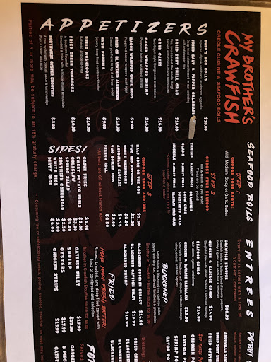 The name "My Brother's Crawfish" itself hints at a sense of camaraderie and kinship that is tragically misplaced. The unfortunate combination of family-oriented terminology and the disappointing culinary offerings only serves to underscore the disappointment that one encounters when faced with the lackluster menu.