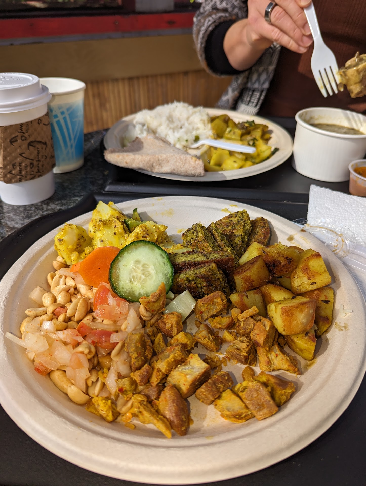 We ordered the Nepali platter and it was pretty disappointing: The little chunks of "barbequed" pork came very dry and completely cold. 1/4 of the plate was filled with just peanuts with some different powdered things put on them as a kind of garnish condiment which although tasty, seems like a kind of subpar move, the cumin potatoes although tasty were half-uncooked and therefore inedible, the fried potatoes were nice but didn't really have a fatty sauce that went well with them. They serve their spicy green sauce in tiny thimble size containers with the single-user Solo plastic waste that I hate. Overall they are doing the wasteful thing of using single use takeout materials for dine-in which I think should be outlawed. Rant: In my opinion, every place that serves dine-in food should serve it on washable plates and every place that does dine out should only use compostable containers.