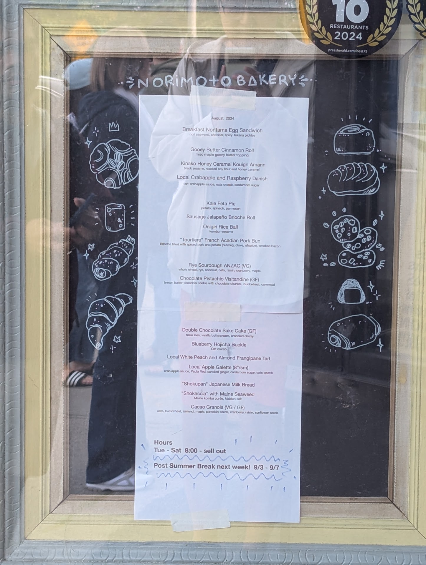 Read moreAfter Atsuko Fujimoto won a James Beard award for outstanding baker, I put this at the top my list for places to visit while we were in town for vacation. We arrived around 10am on Saturday morning and easily found street parking. After getting in line, I popped in next door at Rwanda Bean and got a couple of coffees for myself and my husband while we waited. The line moved quickly and once you get towards the front you can see a list of the days offerings. Once inside there is a case with a sample of each item so you can see what they look like which was incredibly helpful. Nothing appeared to be sold out and there were loads of both sweet and savory options. We ordered the cinnamon roll, blueberry buckle cake, anzac vegan cookie, quiche, kouign amann, jalapeno sausage roll and a bag of the granola. Nothing that we purchased wasn't great. This bakery is absolutely worth the hype. A few notes, the bakery is take away only and there is nowhere to sit down inside and the line is all outdoors so if there is inclement weather do...