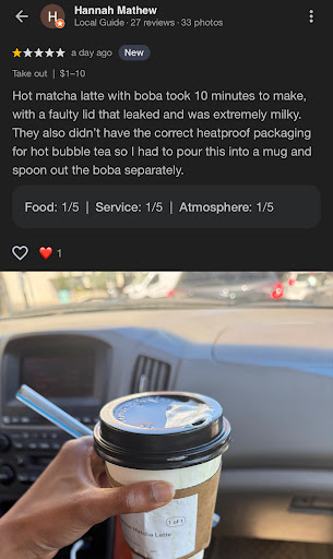 Lessons for Hannah: We could all use more kindness in the world. Immediately cease with hot liquids in plastic cups. You don’t have to be rude. Someone is always watching you. I recommend the Taro flavor (iced of course), the first sip bursts with creamy rich Taro flavor and the gentle texture of warm boba. My sister is newly addicted and we get one together at any...