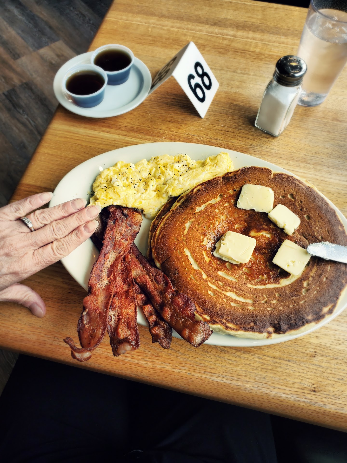 Read moreIt was my third visit to this 24 hour Portland standard must visit. Prompt seating on a Wednesday midmorning of 10/13/20. Wonderful sized menu with lots of breakfast options and lunch stuffs like burger variations. I was going to get hotcakes, but it was 10:30am and I was craving meat, so I got a burger. They grill the bun, it is freshpatties, lots of fresh red onion, tomato, pickle, iceberg. Fresh cut fries were a nice touch, but a little soft for my crunchy liking. Food was spot on nonetheless. My issue was with the service. They take your order and you pay for it right after that. If paying with credit card, they want you to sign and give it to them right then. I have no problem other than I want to leave the tip after I've had my service. I'm a generous tipper, but a blue collar wage. I left $3 on a 9.45 bill before my dining experience. My server was a long, silver haired man with glasses in tye-dyed pants. He was no nonsense, but neglectful of my water glass. I'd have gotten milk with breakfast, but needed lots of water. I left my empty glass on the edge of the table, which is the universal sign of please refill in the restaurant business. No dice even though I had half my burger in my hands. With already being paid up with gratuity, I hoped for a simple hit of water. So, if I didn't have to tip before service because I used my debit card coupled with no drink to finish my meal I gave 3 stars over 5. I'll have to visit late night to gauge the Hotcake House...