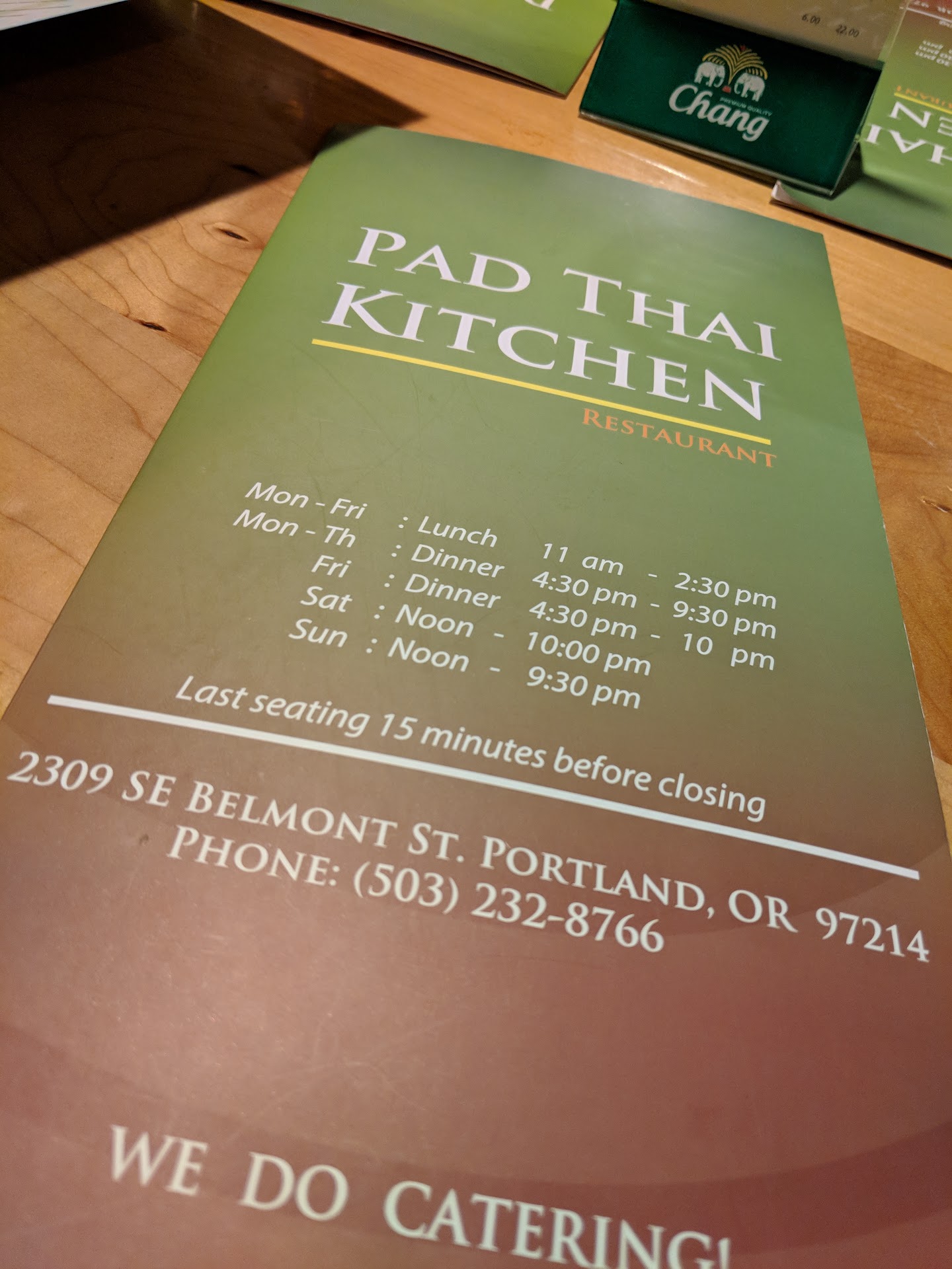 Read moreThe Portland metro area has enough Thai restaurants that it can be difficult to get excited about one particular place. Once you have found a place you like, trying some place new feels like old school biblical adultery. Thai Pad kitchen is a Home Wrecker! This full figured Belmont Harlot is divine, she is a no frills lady with flavor that is warm, inviting and straight to the point. With a group of Eight we were able to sample a broad selection of the menu including the special "yellow curry lamb" Did I mention the yellow curry lamb, or were we talking about the red curry duck? Never mind it doesn't matter everything was great. The only dish that initially fell short was the sweet basil fried rice. Initially you ask, that's right, the next day the sweet basil rice straight from the microwave was impossibly Good. In for a penny in for a pound, the sweet sticky rice (mango is not in season) was comfort food dessert bliss. If you stray from you Thai home, Thai pad kitchen is working hard to steal you...
