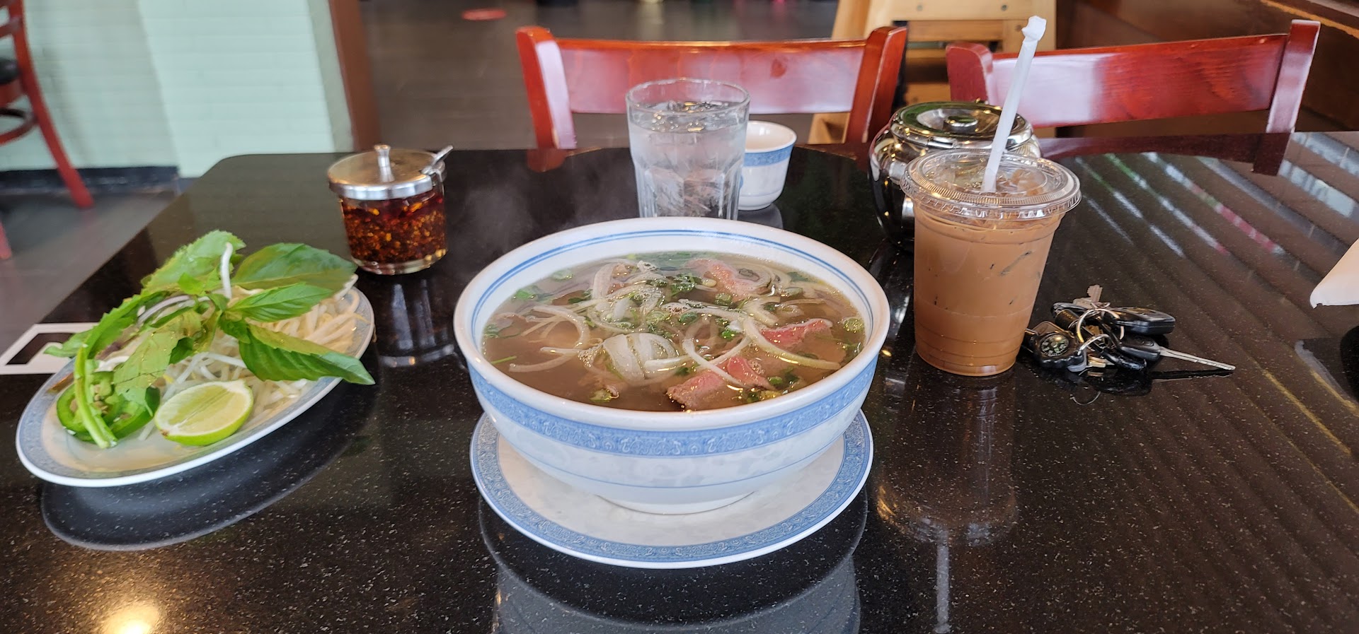 Read moreWe decided to have dinner here. We had the C1 Pho Dac Biet, The broth tasted okay and had some flavor to it. The pho did have a lot of meat and tendon, some of the meat did seem a bit tough to chew. The Pho did not have enough noodles and the bowls were small. Large and small were pretty much the same size bowls. It seemed more like an appetizer than a noodle meal. I had to order extra noodles to be able to get a little full. The bean sprouts and veggies were fresh. The E1 Bun Tom, Cha Gio, Thit Nuong, When mixed all together the vermicelli noodles and veggies tasted fresh including the meat, but the sauce was a little off with flavors and the bowls were small too. The egg rolls tasted good. The Blended Strawberry drink that I ordered tasted good, the strawberry flavors were there and it wasn't too sweet and not too bland. The tea that they serve taste...