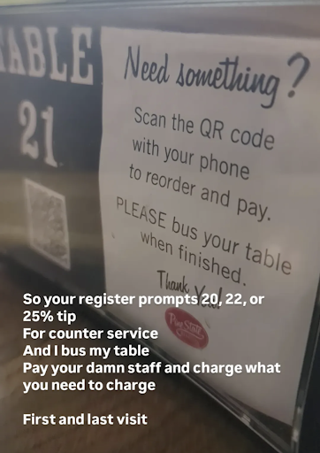 This is counter service. You bus your own tables. You get and refill your own water. And yet when you pay, the screen prompts 20, 22, or 25% tip. Sure there's a custom tip button below but management had decided that instead of paying staff a living wage and building that cost into their prices, they're going to program their POS with table service tip structures.