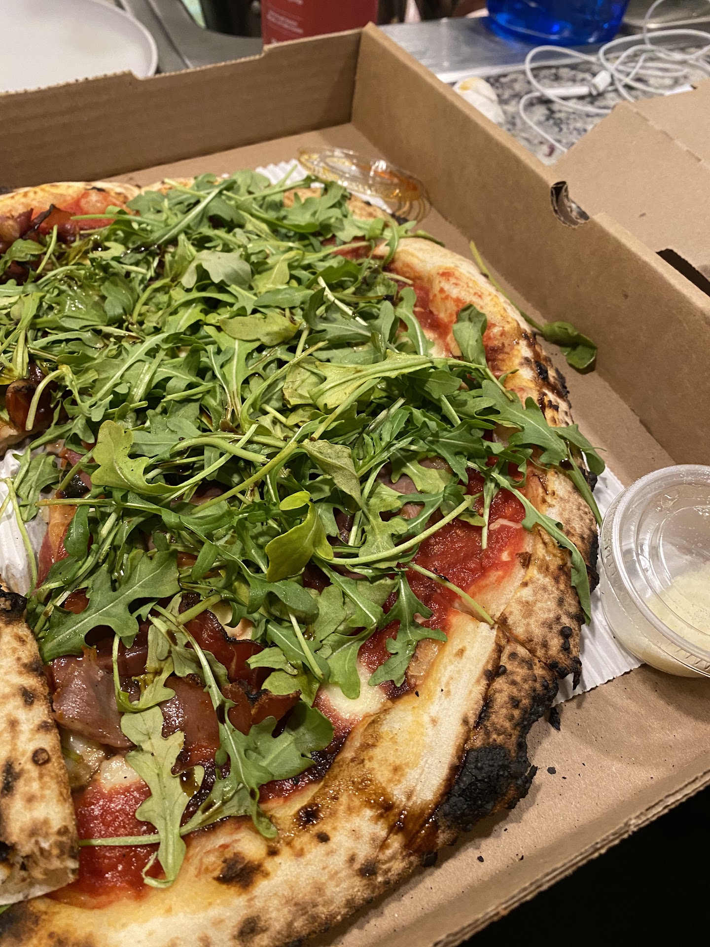 Read moreI’ve tried two pizzas here this week, roasted veggies and garlic bread. Each order was after 4pm. The first one was good ! It was a sausage and mushroom and the roasted veggies were really good, only real complaint with them was that they were too Burnt, same complaint with the garlic bread, the bread was too burnt on top, each bite was filled with a hardcore charcoal taste that would kill the flavor. The sauce that came with the bread, which was manera tasted like - honestly honestly- watered down salsa, I caved and used ranch to try and salvage it. We ate 2/4s of it. The second pizza was just flat out - idk it just seemed like it was going to be really good but wasn’t. The speck and arugula pizza, just not enough flavor. All in all it falls down to the price, the total of all these items spread by two orders was $65. That’s where the super stingy red pepper flakes turned us off. I didn’t check how much they gave me because I assumed it would be an ample amount but based on the picture - I’d say it’s just a waste of a plastic container.