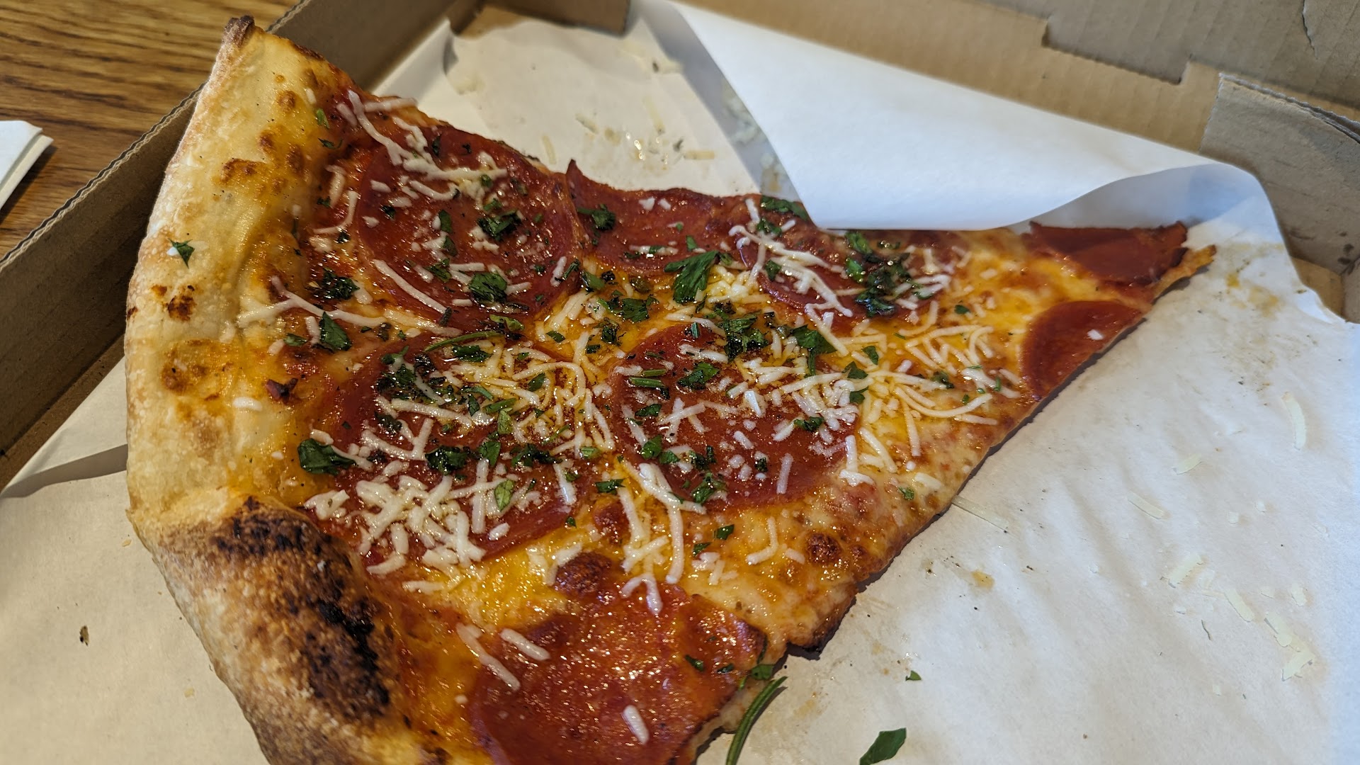 Read moreStopped by for another shop in this strip mall but was in the mood for pizza so thought I'd give this place a try. I got a slice of Puttanesca. All I can say is, wow! This slice is so good, it made me stop midway to write my very first Google review! I asked for the slice to be cooked well done and it came out hot, and the dough is airy and light with a nice crunch. I can say I haven't had a slice like this before...and I love pizza and I've definitely tried my share of random hole in the wall places. The freshly grated cheese and basil that got tossed on there after the slice came out of the oven also made a big difference. If you haven't tried this place before and are on the fence it's say, give it a shot. I would probably be a regular if I lived in the area, but I'll have to settle with bookmarking this place with hopes of stopping here again when I'm...
