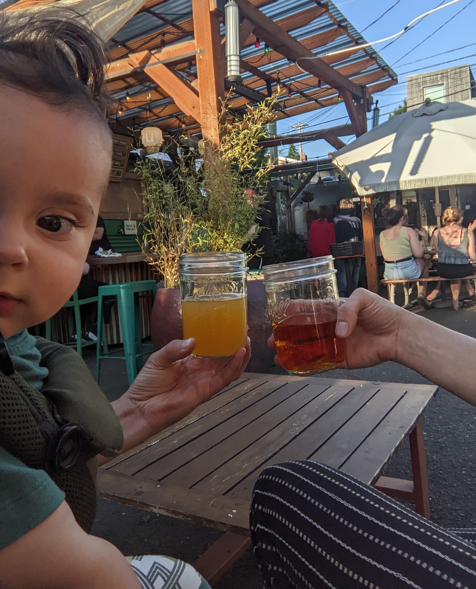 There's a little free library (though it was empty when we went), port-a-potty's with a hand washing station, and I didn't notice a single cord on the ground that I had to step over! The pod was very clean and welcoming. Many of the tables have umbrellas, though we went in the evening when only about half of the tables were shaded, but didn't have a problem finding a table.