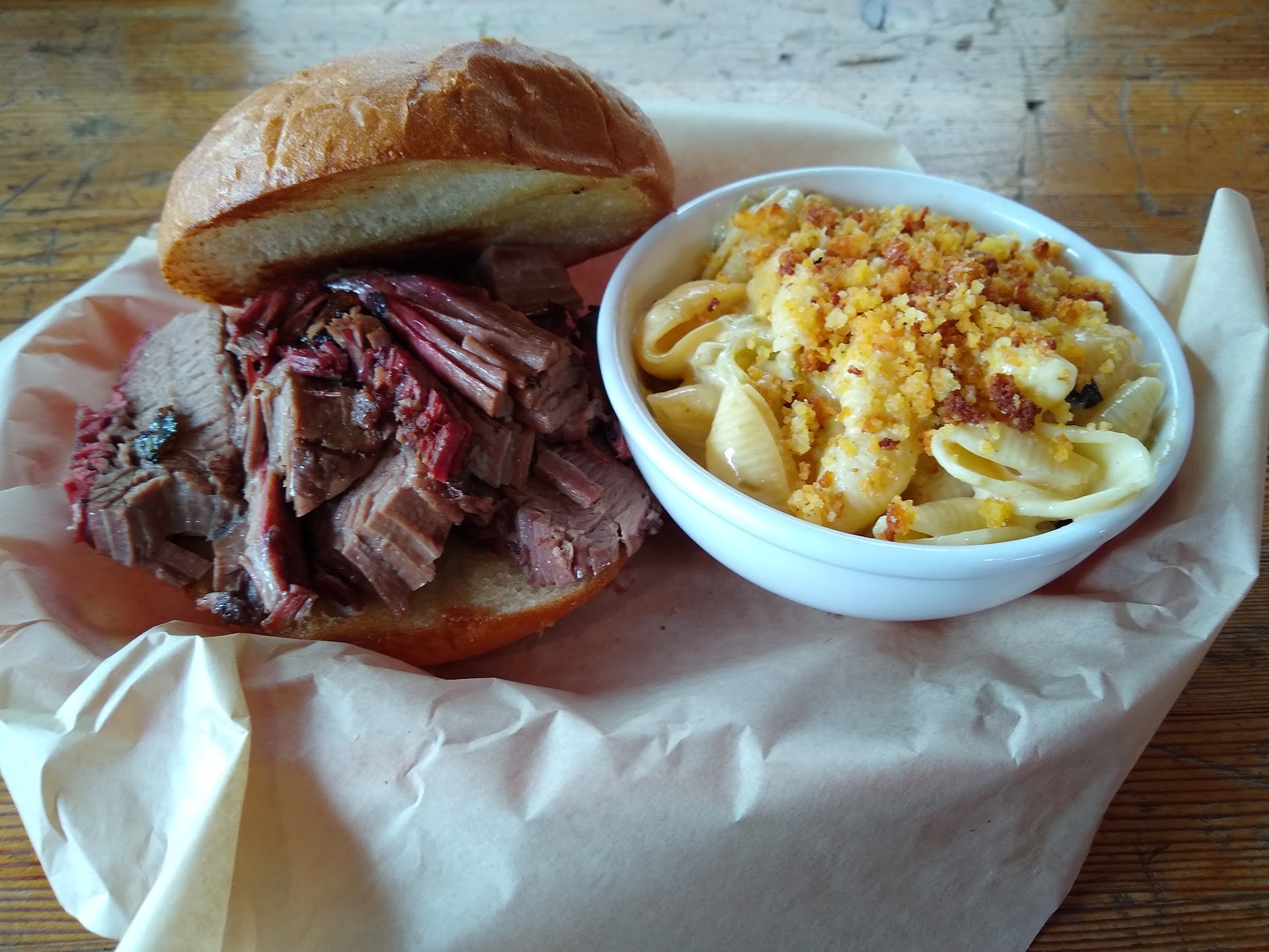 I ordered the sliced beef brisket sandwich with roasted green chili mac and cheese. The mac and cheese is made with orecchietta pasta topped breadcrumbs, was thick and creamy with a little kick from the roasted chili's. It would be great by itself, with cornbread on the side.
