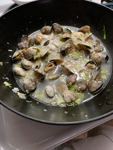 We bought clam chowder inside in the Market's frozen section. In a day or so it was defrosted in refrigerator. Heated in pan. Made garlic bread. I loved it. Hubs says too fishy. Noticed he cleaned his bowl.