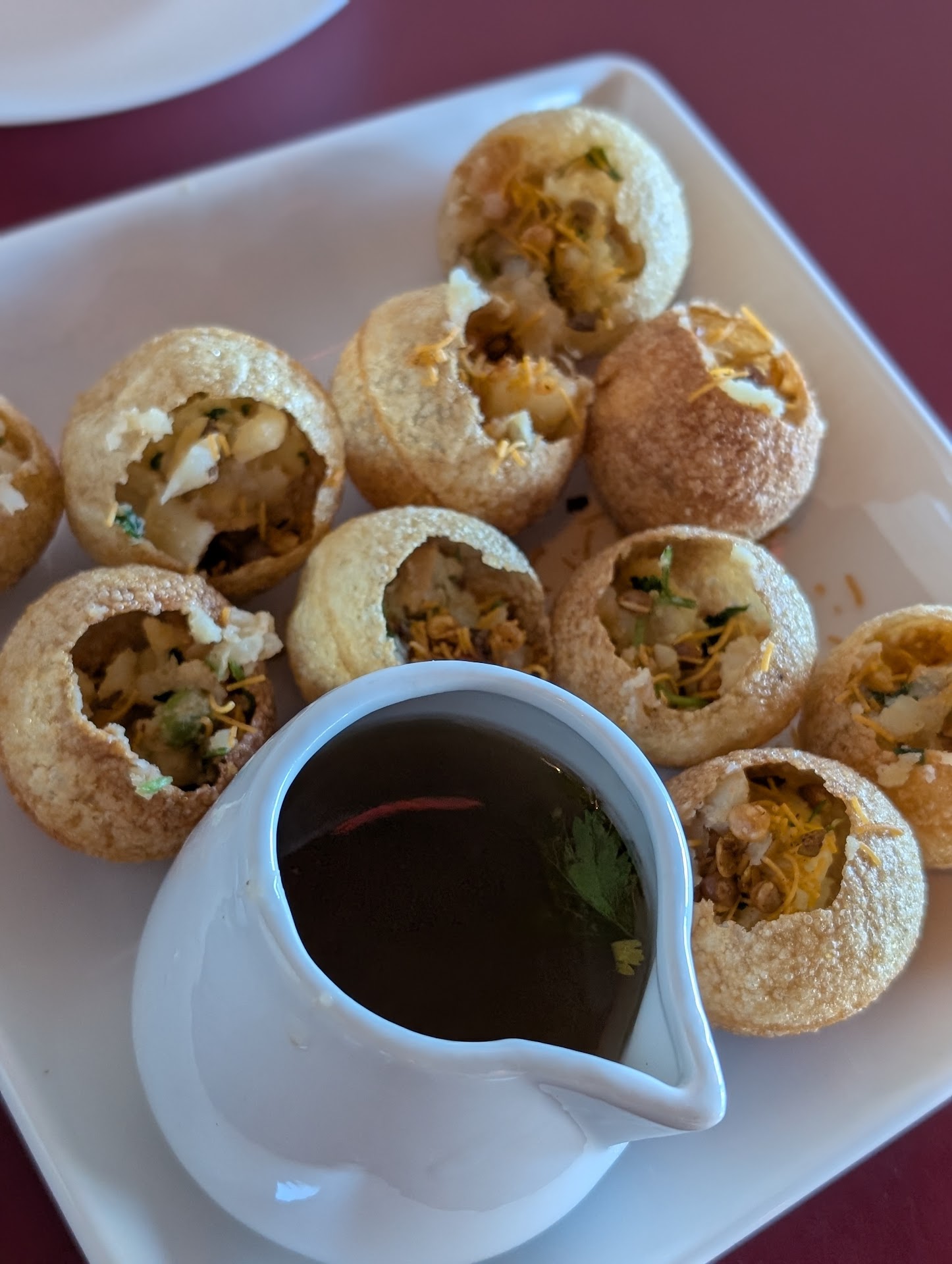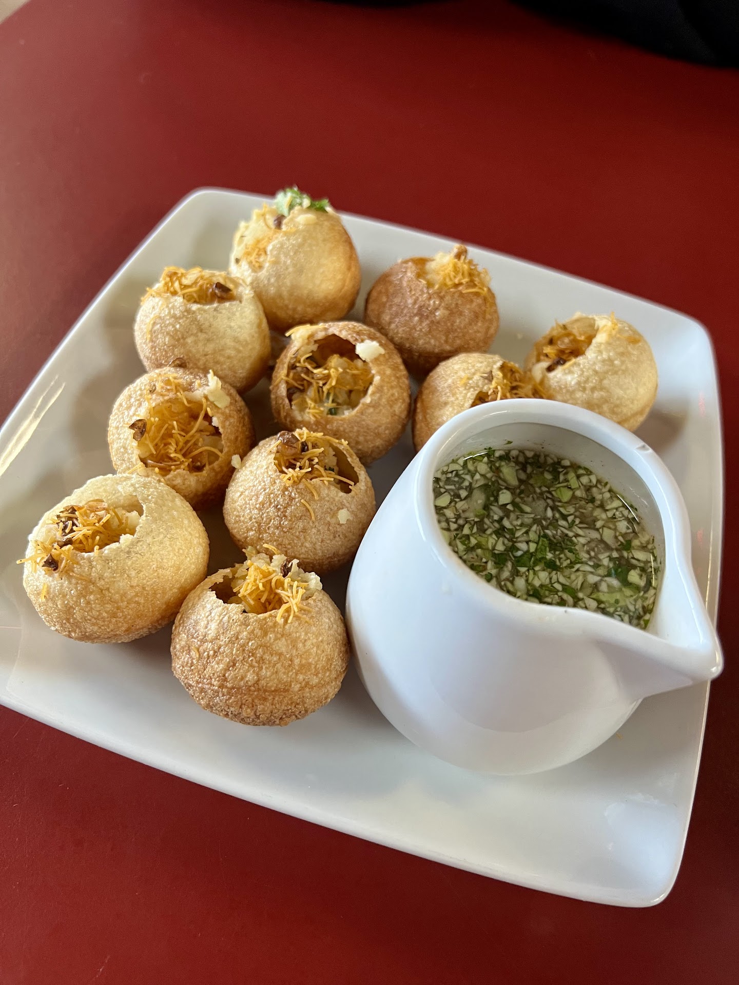 --- appetizers --- ❤️Pani puri ⭐⭐⭐⭐✨ exactly what you'd expect if you've had it before! the iterations I've had came with a chutney, but this one came with a delicate refreshing sort of water that just is delightful it's really good and refreshing super delicate outside doesn't taste as oily as some I've had