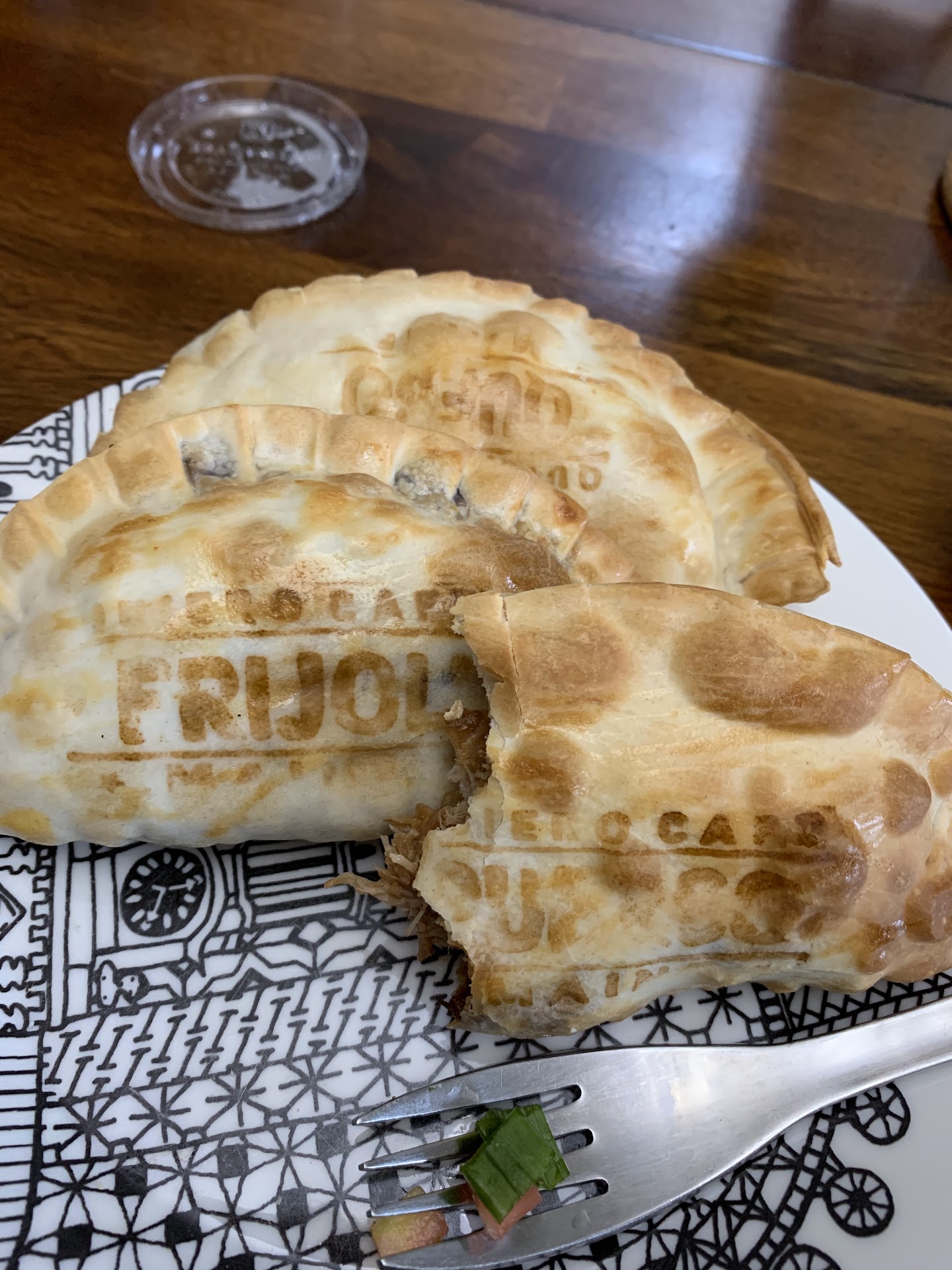 The frijol empanada was delicious! I'll definitely get that again. The other food was good but wasn’t amazing, but they may still be adjusting to business in the time of Covid. We’ll take that into account and eat here again. The pork in my Puerco empanada was dry, The pieces were large, which didn’t help the dryness, and the flavor was bland until I got to the strip of plantain after a couple bites from the edge. I had hoped for an appreciable amount of plantain, throughout, and found that towards the middle. The queso empanada was good, but it tasted a lot like mozzarella and didn’t have much texture, similar to a calzone without any sauce—too one-note. Don’t get me wrong, I love cheese anything, but I was expecting something more flavorful, similar to a queso dip with a bit of mild spice and maybe a couple different Latin American cheeses. A place nearby has the most decadent, flavorful, texturally interesting cheese arepas, and that’s what I‘d hoped for here. The empanadas were large, so I didn’t finish these two and didn’t try the frijol yet. I have a feeling that will be my favorite. Update: the frijol was my favorite. I loved it!