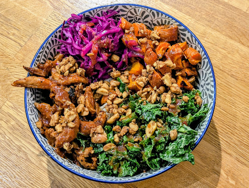 Super flavorful vegan food! This was tricky to find because it’s inside a business building but was well worth the hunt! the food was extremely flavorful, wonderful textures, fresh and healthy, and the portion was extremely generous (I saved half for dinner later). I got the Chickpea Bowl: curried cauliflower and chickpeas over brown rice with tahini rubbed kale, pickled red onions, all covered in an absolutely amazing mint chutney. I added tempeh for some extra protein and it was also delicious. The entire menu was vegan and most things can be made without nuts (I’m allergic so that was a welcome adjustment). HIGHLY recommended! Food was prepared freshly and quickly. Only drawback was the mall/business office like atmosphere but since I took my food back to my hotel it...
