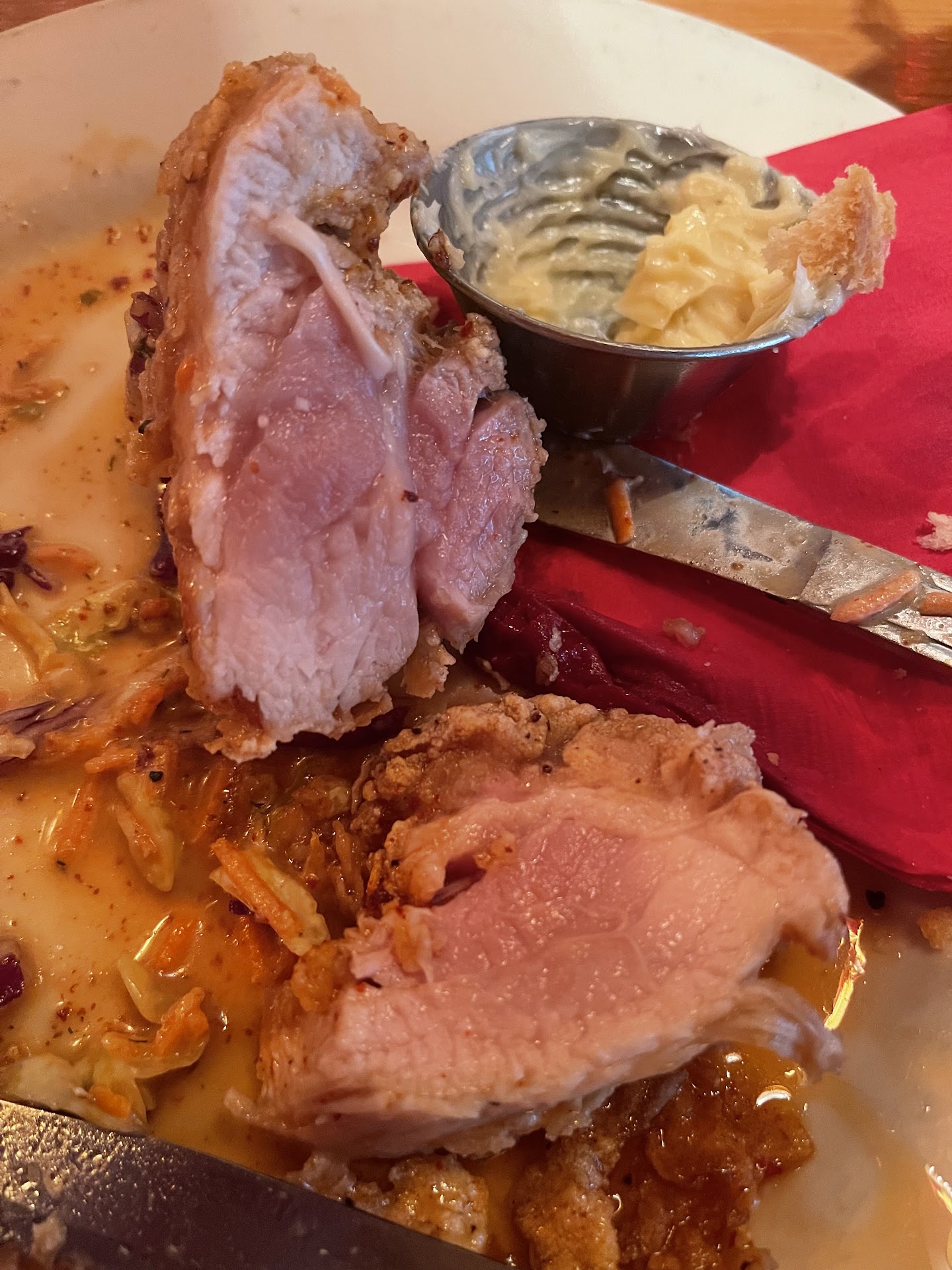 The Bad: The wait time for parties with minors was ~1hr45min, cauliflower appetizer came out to our table already cold, both orders of steak had a very strange charcoal/burnt oil aftertaste, mac n cheese left much to be desired. Fried chicken plate was hardly edible as the only distinct flavors were overcooked flour and a very strange, unexpected sweet sauce of some sort that made me quite nauseous. reminded me a lot of very thin honey, not something i expected with a savory dish (though i will note the chicken itself was moist). The "crispy garlic" potatoes were more so charred than crisp, and not a hint of garlic in them. was really hoping they'd pack more of a punch and instead was very underwhelmed by the rushed preparation that caused them to somehow simultaneously be burnt on the outside and undercooked on the inside.