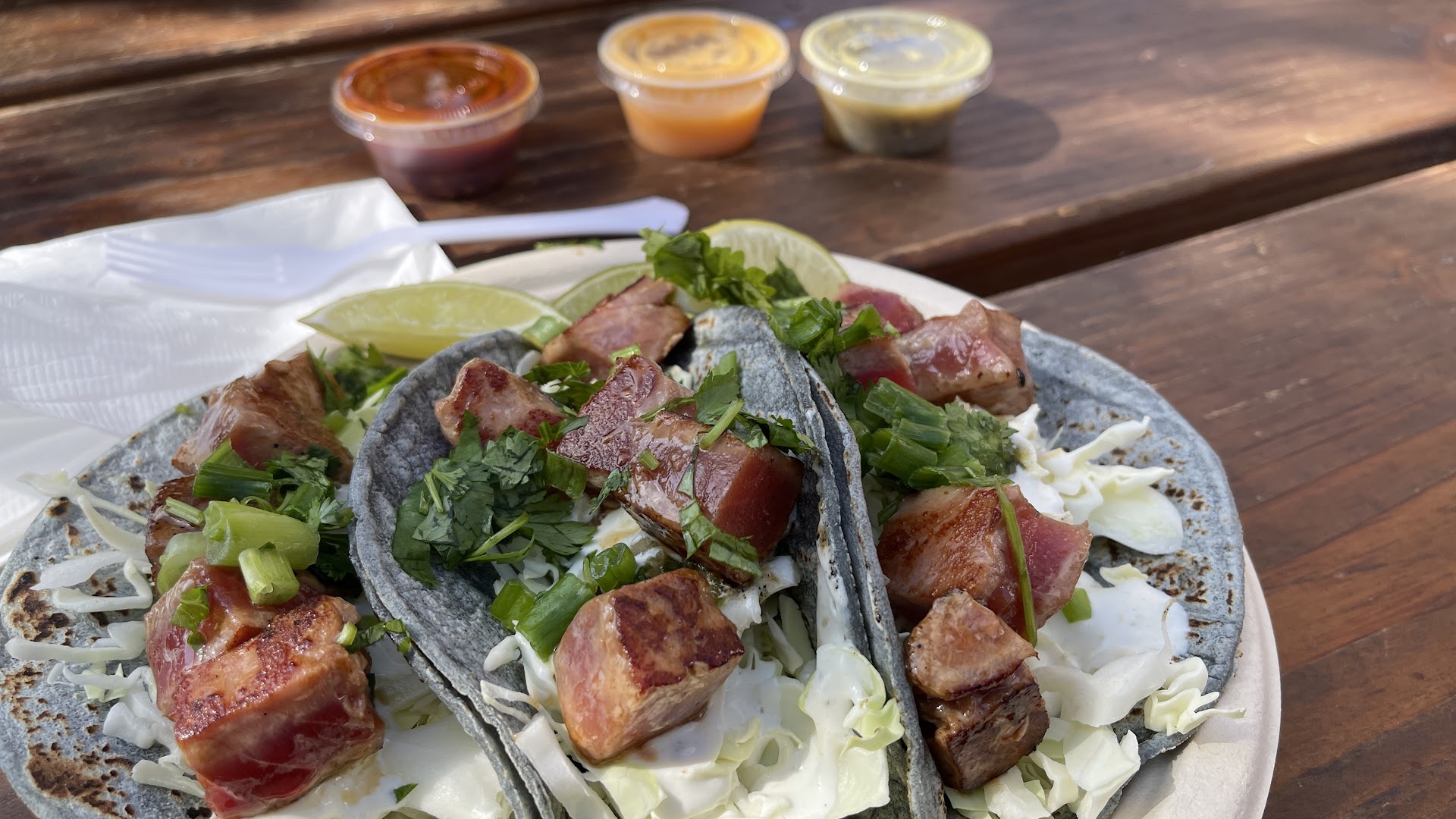 Read moreTL;DR: the Yellowfin Tuna Burrito is a religious experience you need to go through. I was looking for a place to have a bite after climbing and asked someone leaving the gym with me for a recommendation. She pulled one of those all bookmarked google maps and I knew I asked the right person. She suggested that I come here if I was on the go or wanted good atmosphere and she was 100% right. Staff is very friendly and the vibe of the area is very cool. I was not sure what to order and by pure chance I ordered the Yellowfin Tuna Burrito because it stroke me as the most special thing, and I was right. The tuna is marinated on Tamari and it gives it the perfect flavor; on top of it, all the elements of the burrito blend together perfectly… you have rice, cabbage, green onions, and veggies blended together with crema and guacamole… this was a soul-healing nearly-religious experience. I wish i had a pic of the Burrito but it didn’t last long...