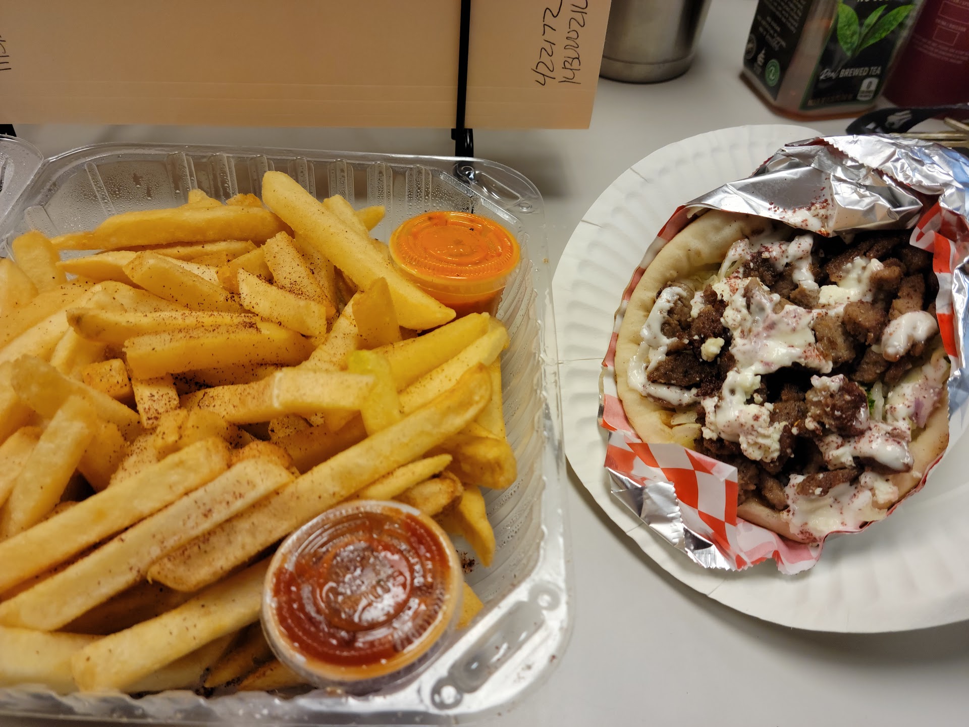 Read moreThe Lamb gyro had pickles, which is very odd. It was very bad as I HATE pickles. The bread was tasteless. 90% was thrown out. The other meal was the Falafel Mezze plate. It was covered in green olives (why?) and very spicy pickled vegetables. The falafel was tasteless and pretty mushy, and the tzatziki and hummus were bland. The person who was to eat this meal can't eat spicy food and hates green olives. If any of these things had been listed, we would have ordered elsewhere. I was still planning on 2 stars until we had the baklava. It was so hard that it had to be thrown out too! By far the worst experience I have had with...