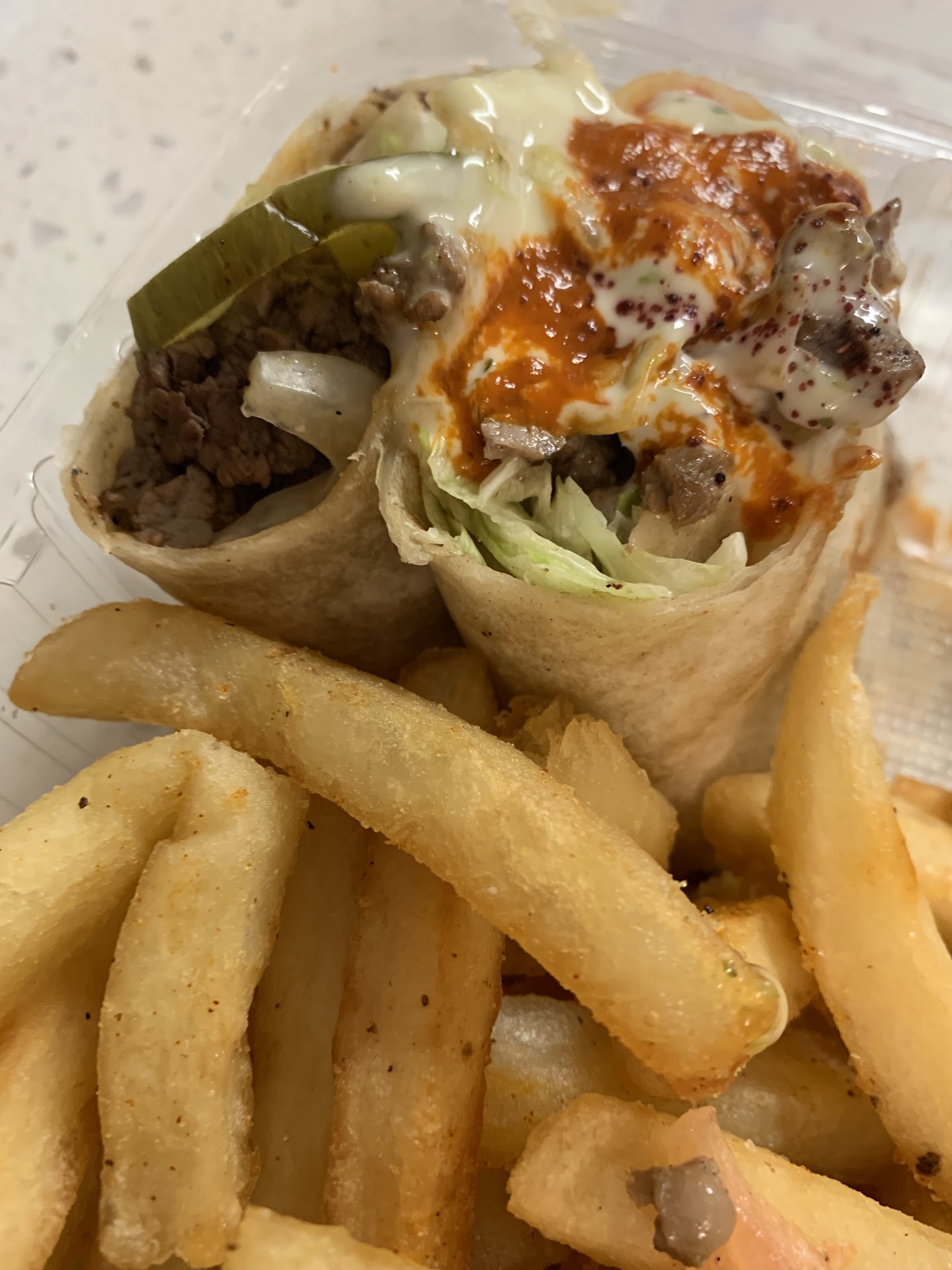 Tonight, I ordered a Beef Arabi with spicy sauce. The meal came with fries, condiments, and I assume utensils (I was in a hurry and didn't let the employee finish their sentence. Sorry!). The young lady who prepared my food was courteous and knew exactly what she was doing when she was cooking.
