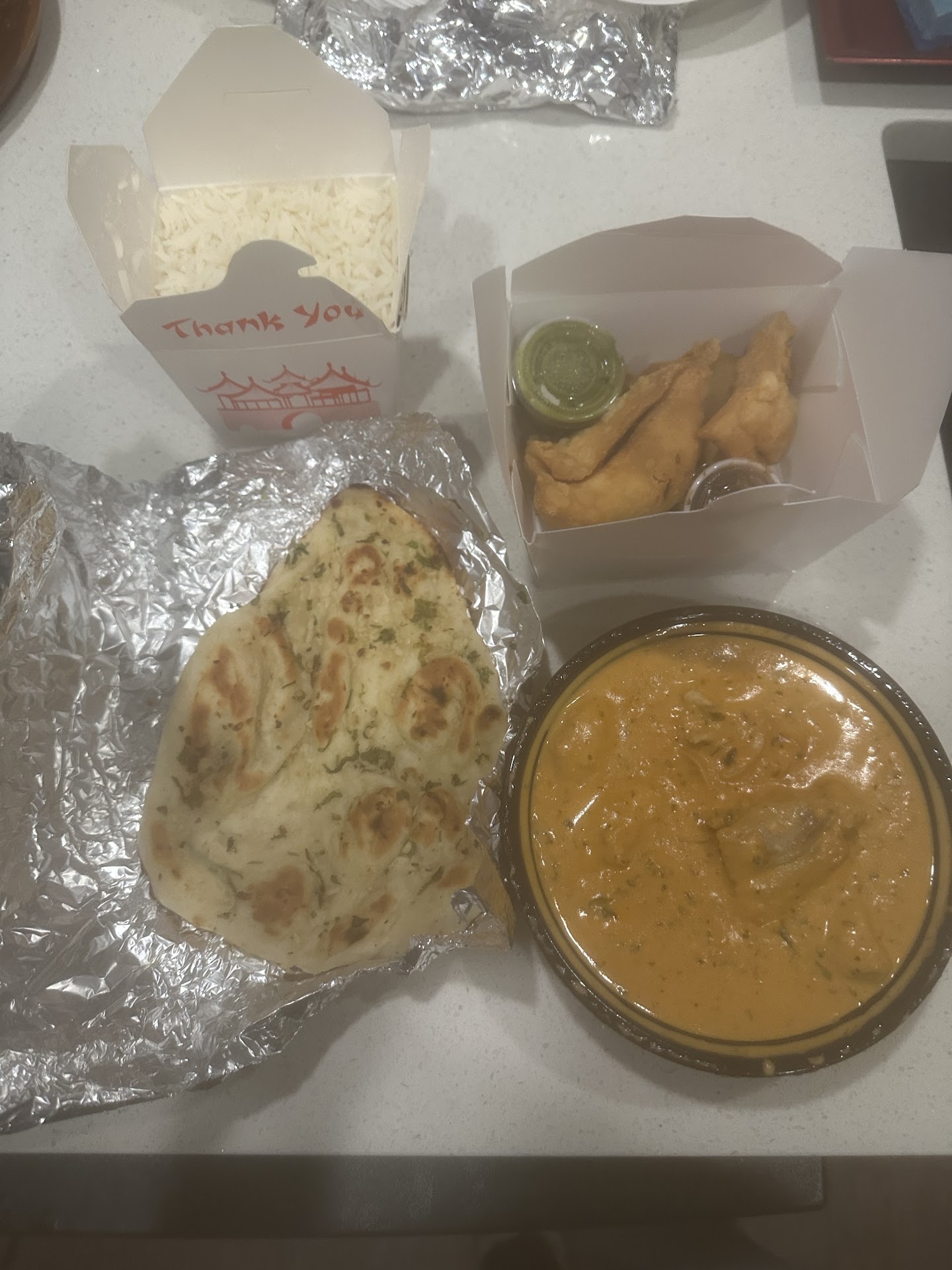 The garlic naan tasted like it was from the freezer isle at the Indian store. Deep Garlic Naan. It had the same exact flavor and shape. I stock these in my freezer.