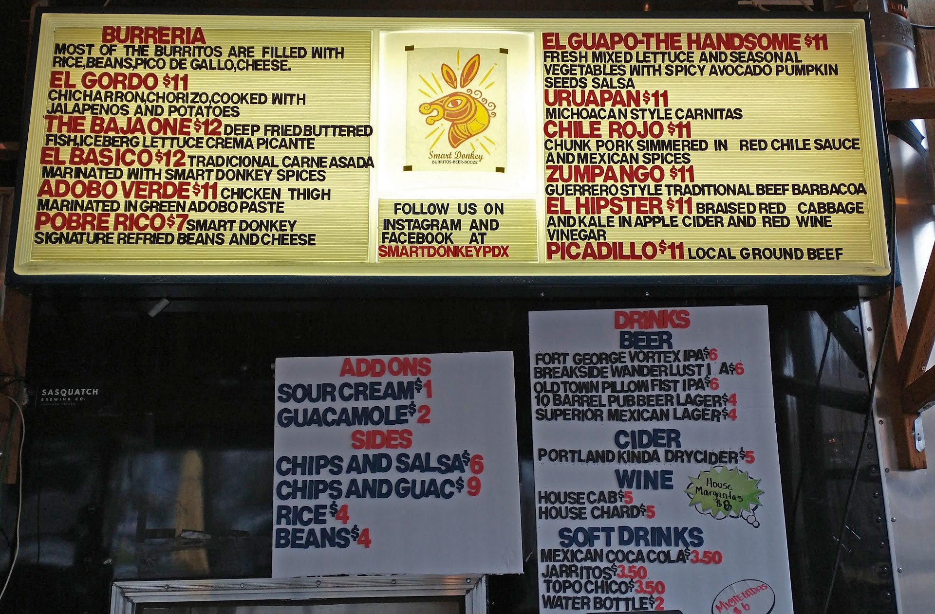 Read moreIt's been a while since I've had a burrito, but Smart Donkey may well shorten the time before I have another. Burritos and drinks are pretty much the only things on the menu, but when you do something well, there's no need to try anything different. At the time of my visit, there were 11 different burritos on the menu. My wife had the Uruapan (Michoacån style carnitas) and I went with El Basico (carne asada). Both were terrific. They seemed a bit on the expensive side, but a single burrito provided two very satisfying lunches. The leftovers reheated quite well. The location is a one-truck cart pod. There are a couple of picnic tables and seating at the bar inside the covered space. The bartenders take food orders and pass them along to the truck itself, that forms the back bar. Outside, there are two large high top covered tables where you can eat standing up. For those familiar with the neighborhood, the truck is in the former DIY car wash location just...