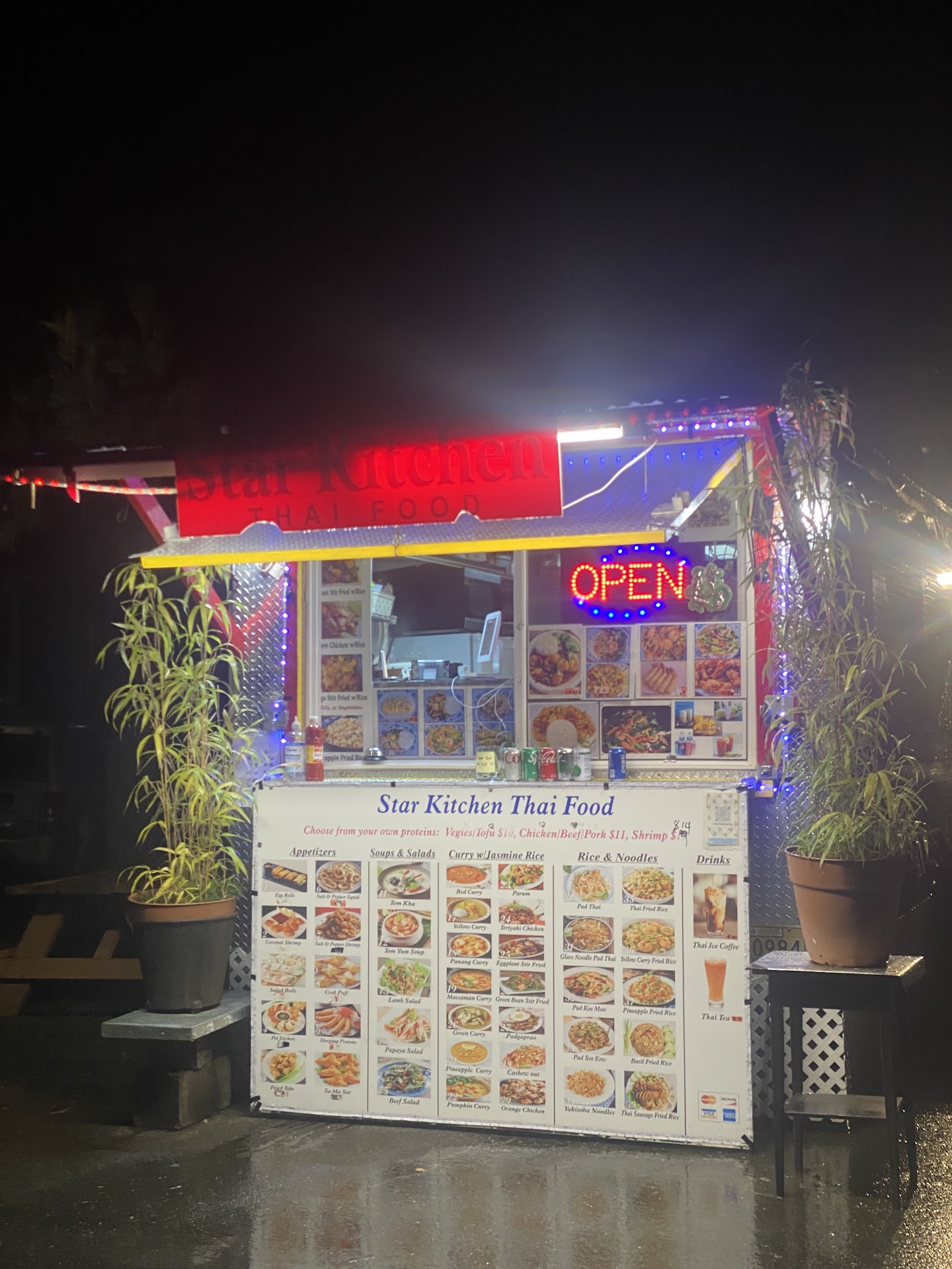 Food cart experience so atmosphere was the outdoors. Ordered beef Pad Saw EW, yakisoba chicken noodles, orange chicken and crab fried rice. Everything tasted so fishy, and the crab fried rice was super fishy / crabby (didn't smell good) yakisoba noodles were flavorless (we had to add some of our own sauce to them when we got home). Orange chicken was soggy (we did sample before we got home to try it at its "freshest" since it was a fried option) the Pad Saw Ew was the only somewhat ok item (but again, had a fishy taste) sadly I was not impressed with the entrees and don't see a return to this food cart. Portions were kinda ok but compared to other food carts it was on the more pricey side (maybe cause of location) Each item is charged higher than it shows on the menu too maybe they need to update the menu - example Pad Saw ew was showing $13.00 but was charged $16 (basically each item we ordered showed $13 but was charged $16) We ordered in person and not online platform (which I kmow those have a mark up associated) Parking in this area can also be tricky as it's street parking but...